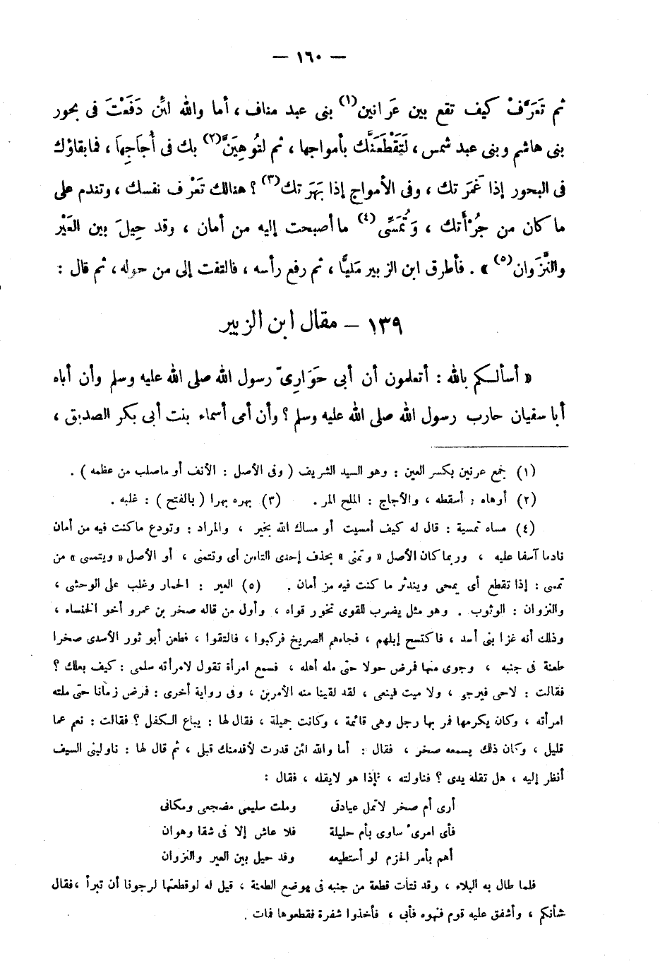 ثم تَعَرَّفْ كيف تقع بين عرانين1 بني عبد مناف، أما والله لئن دفعت في بحور بني هاشم وبني عبد شمس، لتقطعنك بأمواجها، ثم لتوهين2 بك في أجاجها، فما بقاؤك في البحور إذا غمرتك، وفي الأمواج إذا بهرتك3؟ هناك تعرف نفسك، وتندم على ما كان من جرأتك، وتُمَسِّى4 ما أصبحت إليه من أمان، وقد حيل بين العير والنزوان5"، فأطرق ابن الزبير مليا، ثم رفع رأسه، فالتفت إلى من حوله، ثم قال: