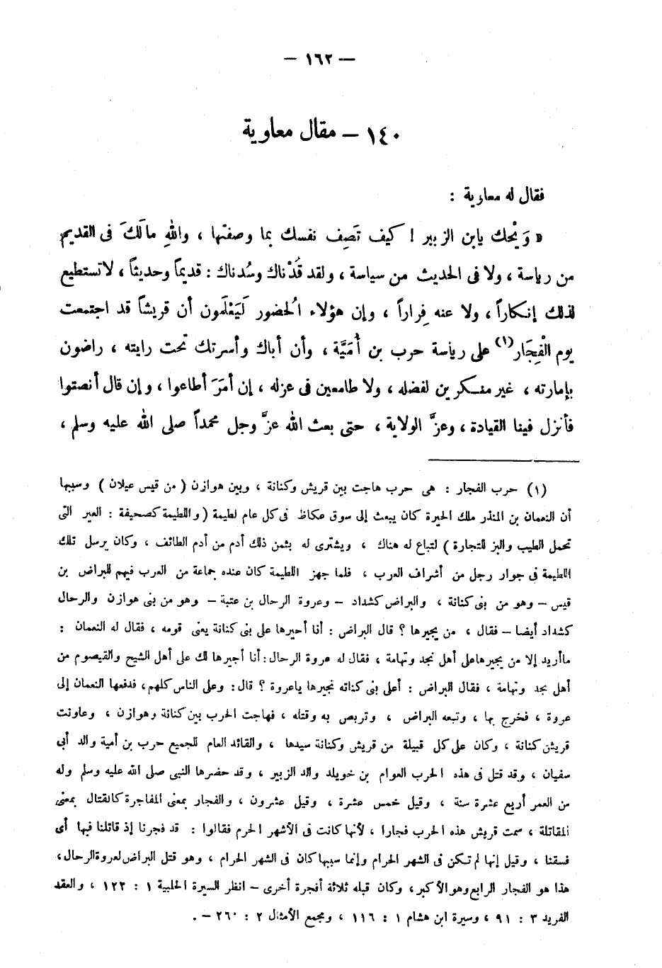 1 حرب الفجار: هي حرب هاجت بين قريش وكنانة، وبين هوازن "من قيس عيلان" وسببها أن النعمان بن المنذر ملك الحيرة كان يبعث إلى سوق عكاظ في كل عام لطيمة "واللطيمة كصحيفة: العير التي تحمل الطيب والبز للتجارة" لتباع له هناك، ويشترى له بثمن ذلك أدم من أدم الطائف، وكان يرسل تلك اللطيمة في جوار رجل من أشراف العرب، فلما جهز اللطيمة كان عنده جماعة من العرب فيهم البراض بن قيس -وهو من بني كنانة، والبراض كشداد- وعروة الرحال بن عتبة -وهو من بني هوازن والرحال كشداد أيضًا- فقال، من يجيرها؟ قال البراض: أنا أجيرها على بني كنانة يعني قومه، فقال له النعمان: ما أريد إلا من يجيرها على أهل نجد وتهامة، فقال له عروة الرحال: أنا أجيرها لك على أهل الشيح والقيصوم من أهل نجد وتهامة، فقال البراض: أعلى بني كنانة تجيرها يا عروة؟ قال: وعلى الناس كلهم، فدفعها النعمان إلى عروة، فخرج بها، وتبعه البراض، وتربص به وقتله، فهاجت الحرب بين كنانة وهوازن، وعاونت قريش كنانة، وكان على كل قبيلة من قريش وكنانة سيدها، والقائد العام للجميع حرب بن أمية والد أبي سفيان، وقد قتل في هذه الحرب العوام بن خويلد والد الزبير، وقد حضرها النبي صَلَّى اللَّهُ عَلَيْهِ وَسَلَّمَ وله من العمر أربع عشرة سنة، وقيل خمس عشرة، وقيل عشرون، والفجار بمعنى المفاجرة كالقتال بمعنى المقاتلة، سمت قريش هذه الحرب فجارًا؛ لأنها كانت في الأشهر الحرم فقالوا: قد فجرنا إذ قاتلنا فيها أي فسقنا، وقيل إنها لم تكن في الشهر الحرام وإنما سببها كان في الشهر الحرام، وهو قتل البراض لعروة الرحال، هذا هو الفجار الرابع وهو الأكبر، وكان قبله ثلاثة أفجرة أخرى- انظر السيرة الحلبية 1: 122، والعقد الفريد 3: 91، وسيرة ابن هشام 1: 116، ومجمع الأمثال 2/ 260-.
