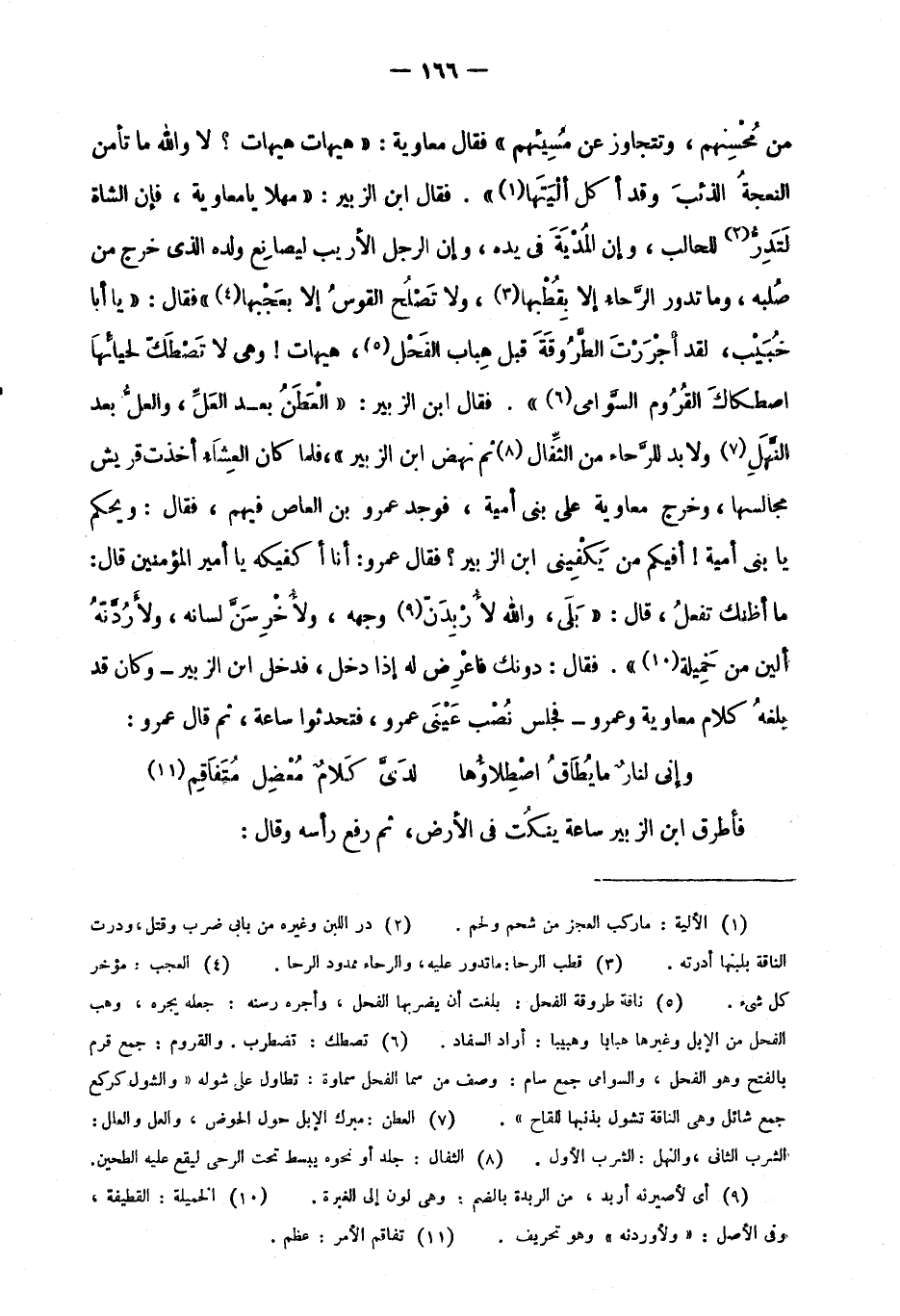 من محسنهم، وتتجاوز عن مسيئهم" فقال معاوية: "هيهات، هيهات؟ لا والله ما تأمن النعجة الذئب وقد أكل ألْيَتَها1". فقال ابن الزبير: "مهلا يا معاوية، فإن الشاة لتدر2 للحالب، وإن المدية في يده، وإن الرجل الأريب ليصانع ولده الذي خرج من صلبه، وما تدور الرحاء إلا بقطبها3، ولا تصلح القوس إلا بعجبها4" فقال: "يا أبا خبيب، لقد أجررت الطروقة قبل هباب الفحل5، هيهات! وهي لا تصطك لحيائها اصطكاك القروم السوامي6". فقال ابن الزبير: "العطن بعد العل، والعل بعد النهل7 ولا بد للرحاء من الثفال8 ثم نهض ابن الزبير"، فلما كان العشاء أخذت قريش مجالسها، وخرج معاوية على بني أمية، فوجد عمرو بن العاص فيهم، فقال: ويحكم يا بني أمية! أفيكم من يكفيني ابن الزبير؟ فقال عمرو: أنا أكفيكه يا أمير المؤمنين قال: ما أظنك تفعل، قال: "بلى، والله لأربدن9 وجهه، ولأخرسن لسانه، ولأردنه ألين من خميلة10". فقال: دونك، فاعرض له إذا دخل، فدخل ابن الزبير -وكان قد بلغه كلام معاوية وعمرو- فجلس نصب عيني عمرو، فتحدثوا ساعة، ثم قال عمرو:
