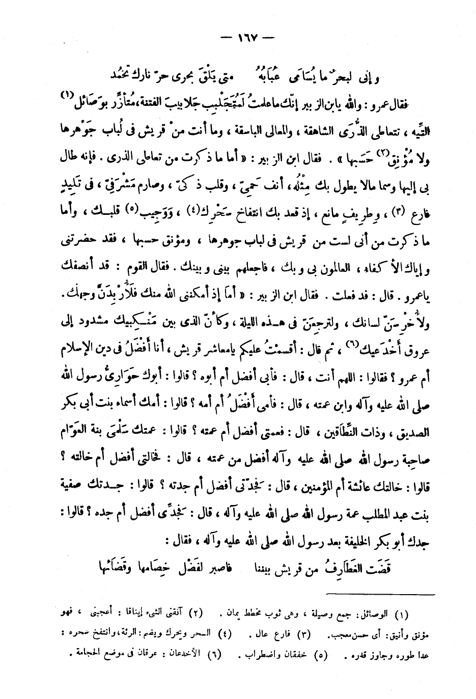فقال عمرو: والله يابن الزبير إنك ما علمتُ لمتجلبب جلابيب الفتنة، متأزر بوصائل1 التيه، تتعاطى الذّرى الشاهقة، والمعالي الباسقة، وما أنت من قريش في لباب جوهرها ولا مؤنق2 حسبها". فقال ابن الزبير: "أما ما ذكرت من تعاطي الذرى؛ فإنه طال بي إليها وسما ما لا يطول بك مثله، أنف حمي، وقلب ذكي، وصارم مشرفي، في تلبيد فارع3، وطريف مانع، إذ قدع بك انتفاخ سحرك4، ووجيب5 قلبك، وأما ما ذكرت من أني لست من قريش في لباب جوهرها، ومؤنق حسبها، فقد حضرتني وإياك الأكفاء، العالمون بي وبك، فاجعلهم بيني وبينك، فقال القوم: قد أنصفك يا عمرو. قال: قد فعلت، فقال ابن الزبير: "أما إذ أمكنني الله منك فلأربدن وجهك، ولأخرسن لسانك، ولترجعن في هذه الليلة، وكأن الذي بين منكبيك مشدود إلى عروق أخدعيك6، ثم قال: أقسمت عليكم يا معاشر قريش، أنا أفضل في دين الإسلام أم عمرو؟ فقالوا: اللهم أنت، قال: فأبي أفضل أم أبوه؟ قالوا: أبوك حواري رسول الله صَلَّى اللَّهُ عَلَيْهِ وَسَلَّمَ وآله وابن عمته، قال: فأمي أفضل أم أمه؟ قالوا: أمك أسماء بنت أبي بكر الصديق، وذات النطاقين، قال: فعمتي أفضل أم عمته؟ قالوا: عمتك سلمى بنت العوام صاحبة رسول الله صلى الله عليه وآله أفضل من عمته، قال: فخالتي أفضل أم خالته؟ قالوا: خالتك عائشة أم المؤمنين، قال: فجدتي أفضل أم جدته؟ قالوا: جدتك صفية بنت عبد المطلب عمة رسول الله صلى الله عليه وآله، قال: فجدي أفضل أم جده؟ قالوا: جدك أبو بكر الخليفة بعد رسول الله صلى الله عليه وآله، فقال: