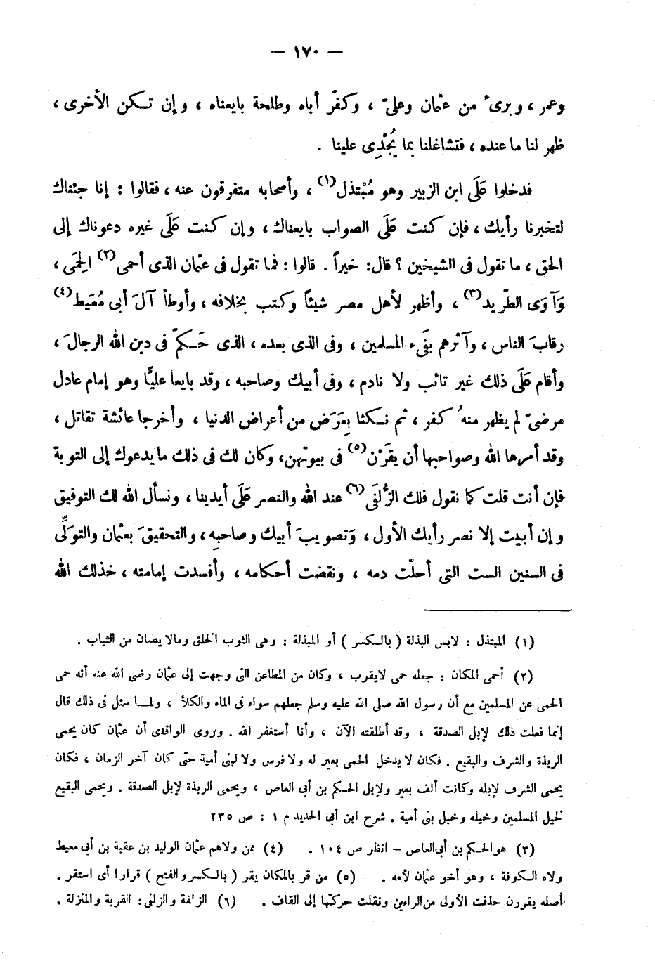 فدخلوا على ابن الزبير وهو مبتذل1، وأصحابه متفرقون عنه، فقالوا: إنا جئناك لتخبرنا رأيك، فإن كنت على الصواب بايعناك، وإن كنت على غيره دعوناك إلى الحق، ما تقول في الشيخين؟ قال: خيرًا. قالوا: فما تقول في عثمان الذي أحمى2 الحمى، وآوى الطريد3، وأظهر لأهل مصر شيئًا وكتب بخلافه، وأوطأ آل أبي معيط4 رقاب الناس، وآثرهم بفيء المسلمين، وفي الذي بعده، الذي حَكَّمَ في دين الله الرجال، وأقام على ذلك غير تائب ولا نادم، وفي أبيك وصاحبه، وقد بايعا عليًّا وهو إمام عادل مرضي لم يظهر منه كفر، ثم نكثا بعرض من أعراض الدنيا، وأخرجا عائشة تقاتل، وقد أمرها الله وصواحبها أن يقرن5 في بيوتهن، وكان لك في ذلك ما يدعوك إلى التوبة، فإن أنت قلت كما نقول فلك الزلفى6 عند الله والنصر على أيدينا، ونسأل الله لك التوفيق وإن أبيت إلا نصر رأيك الأول، وتصويب أبيك وصاحبه، والتحقيق بعثمان والتولي في السنين الست التي أحلت دمه، ونقضت أحكامه، وأفسدت إمامته، خذلك الله