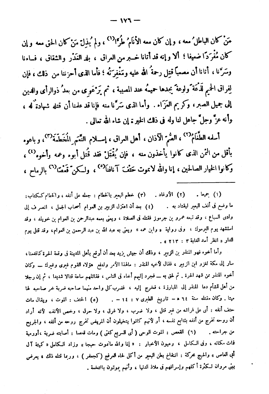من كان الباطلُ معه، وإن كان معه الأنام طرًّا1، ولم يُذِلَّ من كان الحق معه وإن كان مفرَدًا ضعيفًا؛ ألا وإنه قد أتانا خبرٌ من العراقِ بلد الغدر والشقاق، فساءنا وسرنا، أتانا أن مصعبًا قُتِلَ رحمة الله عليه ومغفرته؛ فأما الذي أحزننا من ذلك، فإن لفراقِ الحميم لذعةً ولوعةً يجدها حميمُه عند المصيبة، ثم يرعوِي من بعد ذو الرأي والدين إلى جميل الصبر، وكريم العزاء، وأما الذي سرنا منه فإنا قد علمنا أن قتله شهادة له، وأنه عَزَّ وَجَلَّ جاعل لنا وله في ذلك الخيرة إن شاء الله تعالى.
