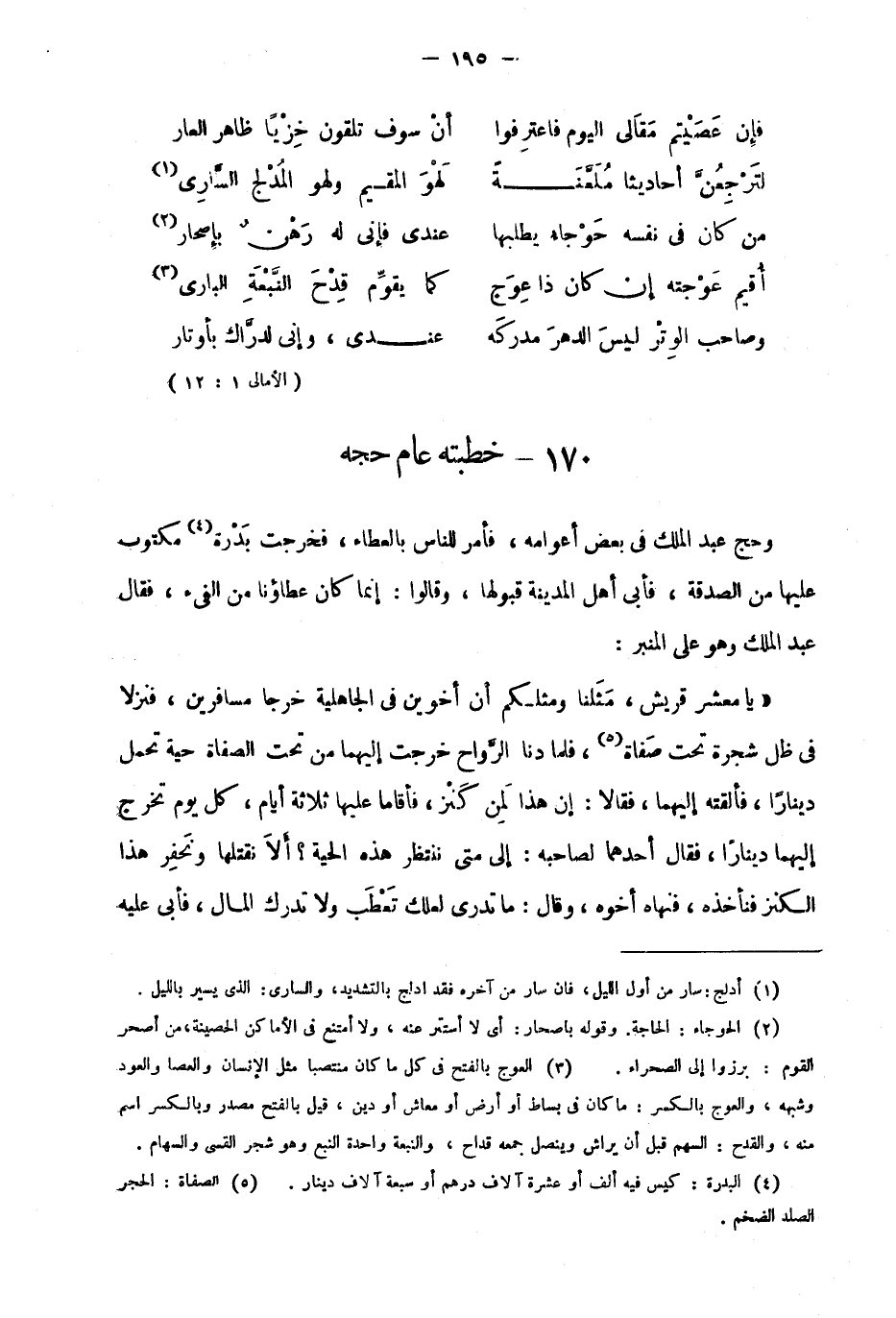 وحج عبد الملك في بعض أعوامه، فأمر الناس بالعطاء، فخرجت بدرة1 مكتوب عليها من الصدقة، فأبى أهل المدينة قبولها، وقالوا: إنما كان عطاؤنا من الفيء، فقال عبد الملك وهو على المنبر: