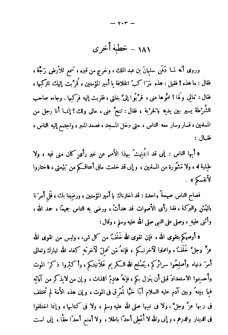 "أوصيكم بتقوى الله، فإن تقوى الله خَلَفٌ من كل شيء، وليس من تقوى الله عَزَّ وَجَلَّ خَلَفٌ، واعملوا لآخرتكم، فإنه من عمل لآخرته كفاه الله تَبَارَكَ وَتَعَالَى أمر دنياه وأصلحوا سرائركم، يصلح الله الكريم علانيتكم، وأكثروا ذكرَ الموت، وأحسنوا الاستعداد قبل أن ينزل بكم، فإنه هادم اللذات، وإن من لا يذكر من آبائه فيما بينه وبين آدم عليه السلام أبًا حيًّا لمعرق في الموت، وإن هذه الأمة لم تختلف في ربها عَزَّ وَجَلَّ، ولا في نبيها صَلَّى اللَّهُ عَلَيْهِ وَسَلَّمَ، ولا في كتابها، وإنما اختلفوا في الدنيار والدرهم، وإني والله لا أعطي أحدًا باطلا، ولا أمنع أحدًا حقًّا، إني لست