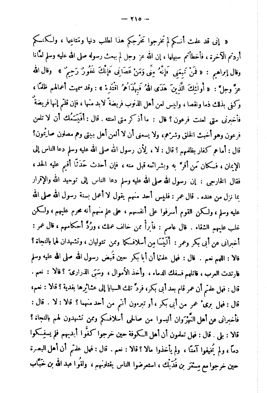 "إني قد علمت أنكم لم تخرجوا مخرجكم هذا لطلب دنيا ومتاعها، ولكنكم أردتم الآخرة، فأخطأتم سبيلها، إن الله عَزَّ وَجَلَّ لم يبعث رسوله صَلَّى اللَّهُ عَلَيْهِ وَسَلَّمَ لعانًا وقال إبراهيم: {فَمَنْ تَبِعَنِي فَإِنَّهُ مِنِّي وَمَنْ عَصَانِي فَإِنَّكَ غَفُورٌ رَحِيمٌ} وقال الله عَزَّ وَجَلَّ: {أُولَئِكَ الَّذِينَ هَدَى اللَّهُ فَبِهُدَاهُمُ اقْتَدِهْ} ، وقد سميت أعمالهم ظلمًا، وكفى بذلك ذمًا ونقصًا، وليس لعن أهل الذنوب فريضة لا بد منها، فإن قلتم إنها فريضة فأخبرني متى لعنت فرعون؟ قال: ما أذكر متى لعنته. قال: أفيسعك أن لا تلعن فرعون وهو أخبث الخلق وشرهم، ولا يسعني أن لا ألعن أهل بيتي وهم مصلون صائمون؟ قال: أما هم كفار بظلمهم؟ قال: لا؛ لأنَّ رسول الله صَلَّى اللَّهُ عَلَيْهِ وَسَلَّمَ دعا الناس إلى الإيمان، فكان من أقرَّ به وبشرائعه قبل منه، فإن أحدَثَ حدثًا أُقِيمَ عليه الحد، فقال الخارجي: إن رسول الله صَلَّى اللَّهُ عَلَيْهِ وَسَلَّمَ دعا الناس إلى توحيد الله والإقرار بما نزل من عنده. قال عمر: فليس أحد منهم يقول: لا أعمل بسنة رسول الله صَلَّى اللَّهُ عَلَيْهِ وَسَلَّمَ، ولكن القوم أسرفوا على أنفسهم، على علم منهم أنه محرم عليهم، ولكن غلب عليهم الشقاء قال عاصم: فابرأ ممن خالف عملك، وردَّ أحكامهم، قال عمر: أخبراني عن أبي بكر وعمر: أليسا من أسلافكما وممن تتوليان، وتشهدان لهما بالنجاة؟ قالا: اللهم نعم. قال: فهل علمتما أن أبا بكر حين قُبِضَ رسول الله صَلَّى اللَّهُ عَلَيْهِ وَسَلَّمَ فارتدت العربُ، قاتلَهُم فسَفَكَ الدماء، وأَخَذَ الأموالَ، وسبى الذراري؟ قالا: نعم. قال: فهل علمتم أن عمر قام بعد أبي بكر، فردَّ تلك السبايا إلى عشائرِها بفدية؟ قالا: نعم، قال: فهل بَرِئَ عمرُ من أبي بكر، أو تبرءون أنتم من أحدٍ منهما؟ قالا: لا. قال: فأخبراني عن أهل النهروان أليسوا من صالحي أسلافكم وممن تشهدون لهم بالنجاة؟ قالا: بلى، قال: فهل تعلمون أن أهل الكوفة حين خرجوا كفوا أيديهم فلم يسفكوا دمًا، ولم يخيفوا آمنًا، ولم يأخذوا مالا؟ قالا: نعم. قال: فهل علمتم أن أهل البصرة حين خرجوا مع مسعر بن فُدَيك، اسْتَعْرَضُوا الناسَ يَقْتُلُونهم، ولقوا عبد الله بن خبّاب