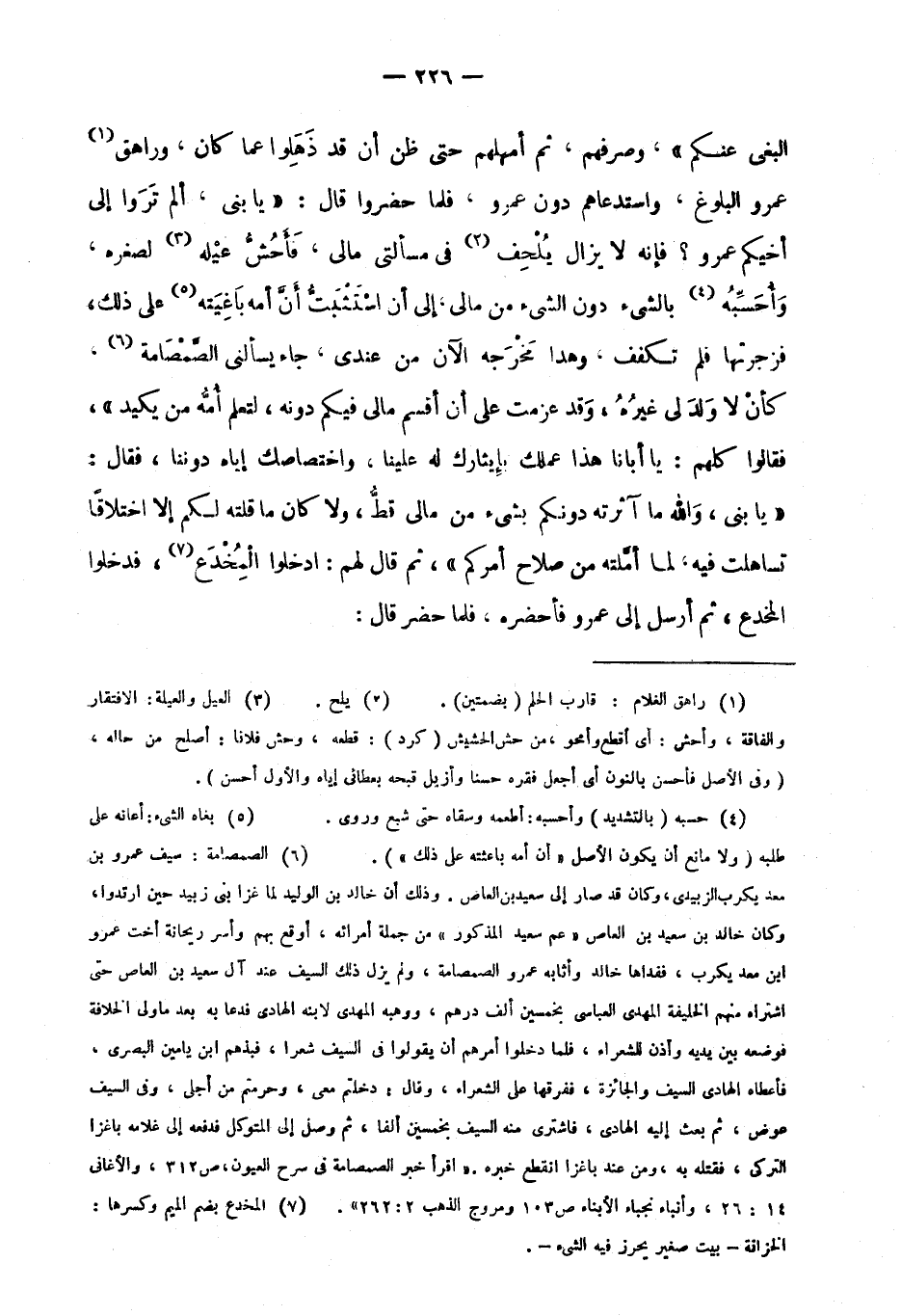 البغي عنكم" وصرفهم، ثم أمهلهم حتى ظن أن قد ذهلوا عما كان، وراهق1 عمرو البلوغ، واستدعاهم دون عمرو، فلما حضروا قال: "يا بني، ألم تروا إلى أخيكم عمرو؟ فإنه لا يزال يلحف2 في مسألتي مالي، فأحش عيله3 لصغره، وَأُحَسِّبُهُ4 بالشيء دون الشيء من مالي إلى أن استثبت أن أمه باغيته5 على ذلك، فزجرتها فلم تكفف، وهذا مخرجه الآن من عندي، جاء يسألني الصمصامة6، كأن لا ولد لي غيره، وقد عزمت على أن أقسم مالي فيكم دونه، لتعلم أمه من يكيد"، فقالوا كلهم: يا أبانا هذا عملك بإيثارك له علينا، واختصاصك إياه دوننا، فقال: "يا بني، والله ما آثرته دونكم بشيء من مالي قط، ولا كان ما قلته لكم إلا اختلافا تساهلت فيه لما أملته من صلاح أمركم"، ثم قال لهم: ادخلوا المخدع7، فدخلوا المخدع، ثم أرسل إلى عمرو فأحضره، فلما حضر قال: