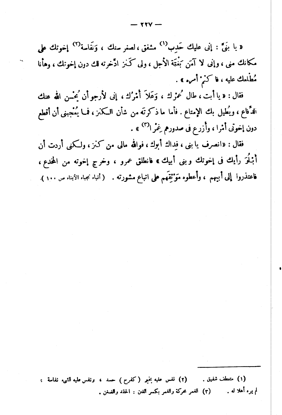 "يا بني: إني عليك حدب1 مشفق، لصغر سنك، ونفاسة2 إخوتك على مكانك مني، وإني لا آمن بغتة الأجل، ولى كنز ادخرته لك دون إخوتك، وها أنا مطلعك عليه، فاكتم أمره".