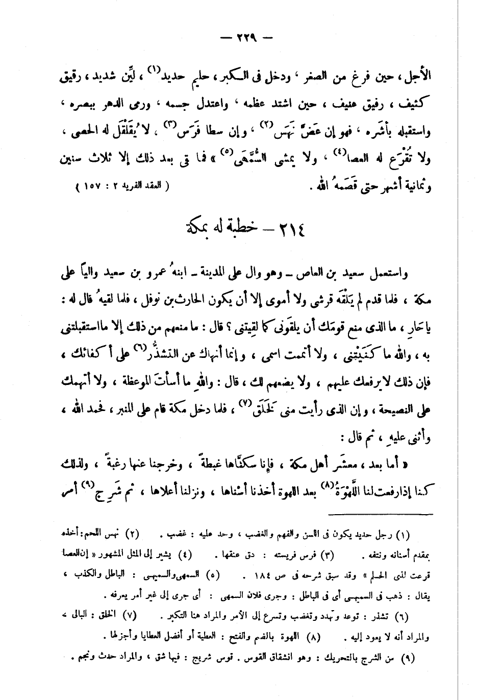 "أما بعد، معشر أهل مكة فإنا سكنَّاها غبطة، وخرجنا عنها رغبة، ولذلك كنا إذا رفعت لنا اللهوة3 بعد اللهوة أخذنا أسناها، ونزلنا أعلاها، ثم شرج4 أمر