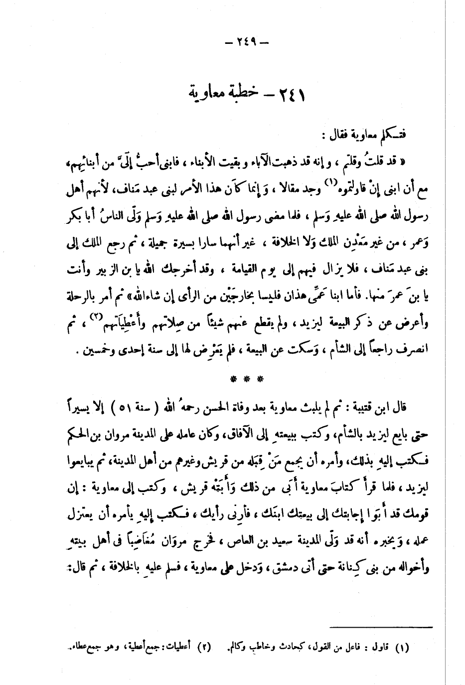 "قد قلت وقلتم، وإنه قد ذهبت الآباء وبقيت الأبناء، فابني أحب إلي من أبنائهم، ومع أن ابني إن قاولتموه1 وجد مقالا، وإنما كان هذا الأمر لبني عبد مناف لأنهم أهل رسول الله صَلَّى اللَّهُ عَلَيْهِ وَسَلَّمَ، فلما مضى رسول الله صَلَّى اللَّهُ عَلَيْهِ وَسَلَّمَ وَلَّى الناس أبا بكر وعمر، من غير مَعْدِن الملك ولا الخلافة، غير أنهما سارا بسيرة جميلة، ثم رجع الملك إلى بني عبد مناف، فلا يزال فيهم إلى يوم القيامة، وقد أخرجك الله يابن الزبير وأنت يابن عمر منها، فأما ابنا عمي هذان فليسا بخارجين من الرأي إن شاء الله". ثم أمر بالرحلة وأعرض عن ذكر البيعة ليزيد، ولم يقطع عنهم شيئًا من صلاتهم وأعطياتهم2، ثم انصرف راجعًا إلى الشام، وسكت عن البيعة، فلم يعرض لها إلى سنة إحدى وخمسين.