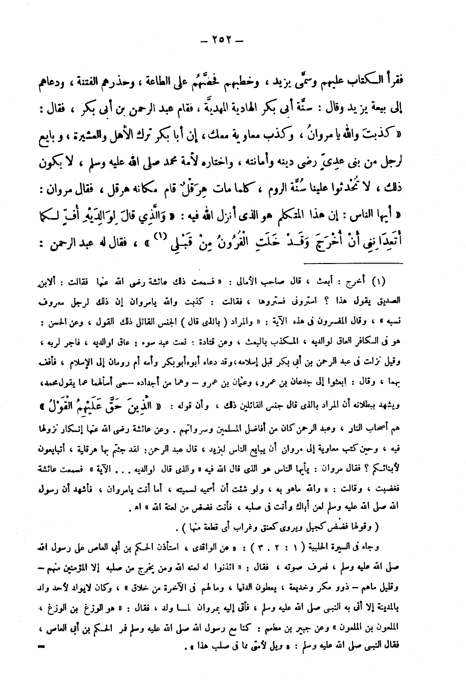 فقرأ الكتاب عليهم وسمى يزيد، وخطبهم، فحضهم على الطاعة، وحذرهم الفتنة، ودعاهم إلى بيعة يزيد وقال: سنة أبي بكر الهادية المهدية، فقام عبد الرحمن بن أبي بكر، فقال: "كذبت والله يا مروان، وكذب معاوية معك، إن أبا بكر ترك الأهل والعشيرة، وبايع لرجل من بني عدي رضي دينه وأمانته، واختاره لأمة محمد صَلَّى اللَّهُ عَلَيْهِ وَسَلَّمَ، لا يكون ذلك، لا تحدثوا علينا سنة الروم، كلما مات هرقل قام مكانه هرقل، فقال مروان: "أيها الناس: إن هذا المتكلم هو الذي أنزل الله فيه: {وَالَّذِي قَالَ لِوَالِدَيْهِ أُفٍّ لَكُمَا أَتَعِدَانِنِي أَنْ أُخْرَجَ وَقَدْ خَلَتِ الْقُرُونُ مِنْ قَبْلِي 1} ، فقال له عبد الرحمن: