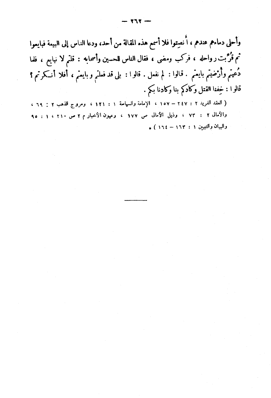 وأحلى دماءهم عندهم، أنصتوا فلا أسمع هذه المقالة من أحد، ودعا الناس إلى البيعة، فبايعوا ثم قربت رواحله، فركب ومضى، فقال الناس للحسين وأصحابه: قلتم: لا نبايع، فلما دعيتم وأرضيتم بايعتم. قالوا: لم نفعل. قالوا: بلى قد فعلتم وبايعتم، أفلا أنكرتم؟