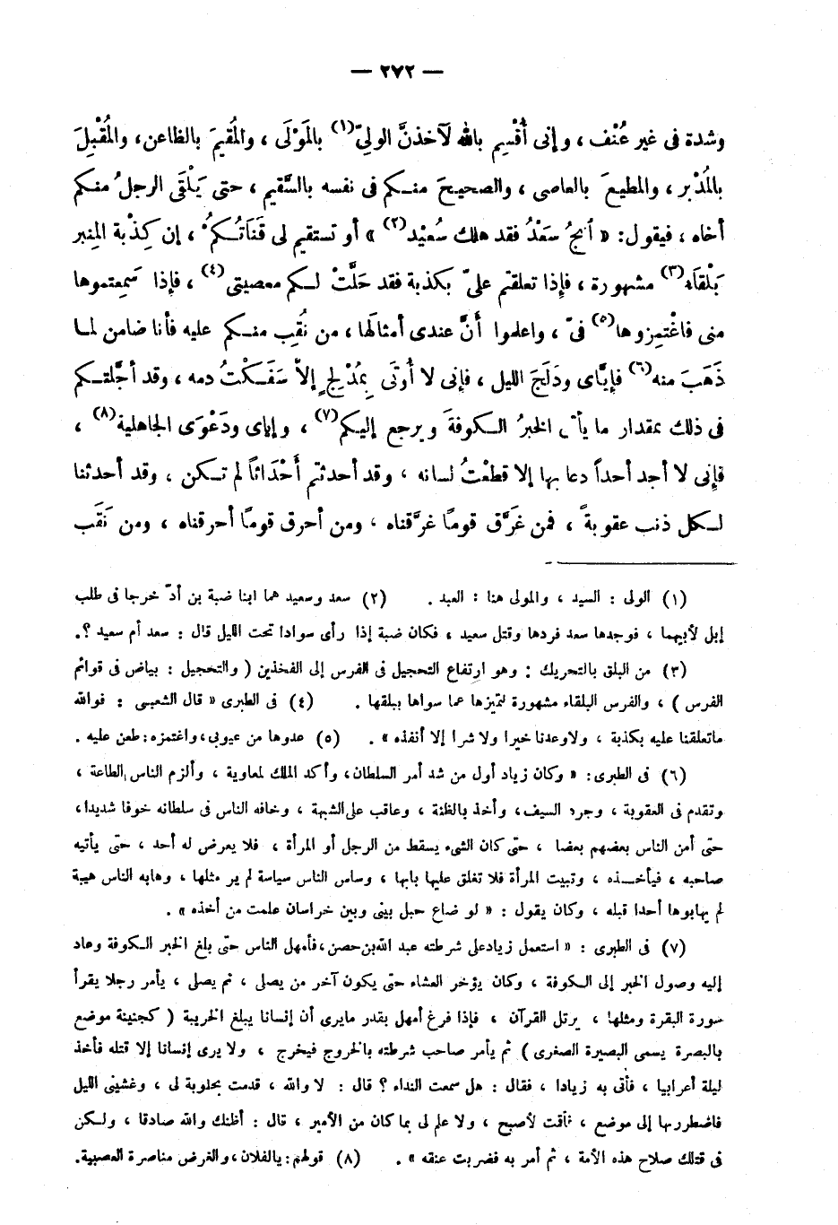 6 في الطبري: "وكان زياد أول من شدَّ أمر السلطان، وأكد الملك لمعاوية، وألزم الناس بالطاعة، وتقدم في العقوبة، وجرد السيف، وأخذ بالظنة، وعاقب على الشبهة، وخافه الناس في سلطانه خوفًا شديدًا، حتى أمن الناس بعضهم بعضًا، حتى كان الشيء يسقط من الرجل أو المرأة؛ فلا يعرض له أحد، حتى يأتيه صاحبه؛ فيأخذه، وتبيت المرأة فلا تغلق عليها بابها، وساس الناس سياسة لم يُرَ مثلها، وهابه الناس هيبة لم يهابوها أحدًا قبل، وكان يقول: "لو ضاع حبل بيني وبين خراسان علمت من أخذه".