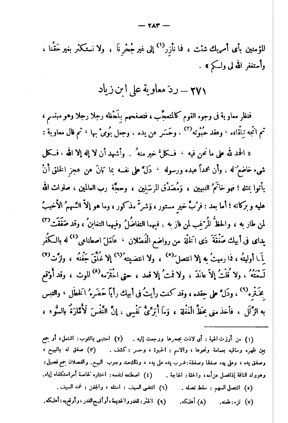 فنظر معاوية في وجوه القوم كالمتعجب، فتصفحهم بلحظه رجلًا رجلًا وهو مبتسم، ثم اتجه تلقاءه، وعقد حبوته1، وحسر عن يده، وجعل يومي بها، ثم قال معاوية: