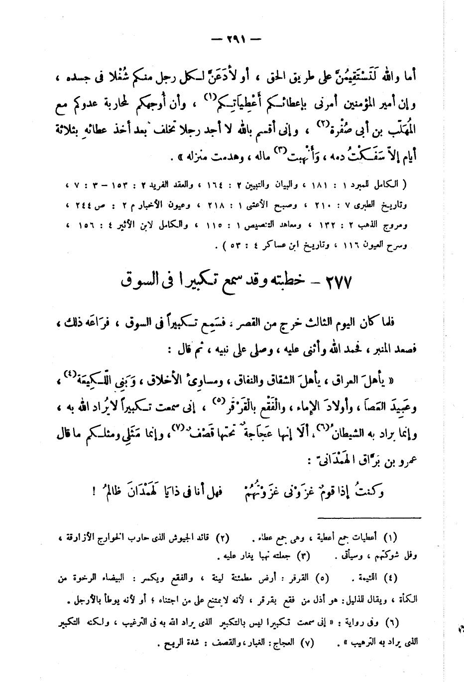 "الكامل للمبرد 1: 181، والبيان والتبيين 2: 164، والعقد الفريد 2: 153- 3: 7، وتاريخ الطبري 7: 210، وصبح الأعشى 1: 218، وعيون الأخبار م2: ص244، ومروج الذهب 2: 132، ومعاهد التنصيص 1: 115، والكامل لابن الأثير 4: 156، وسرح العيون 116، وتاريخ ابن عساكر 4: 53".