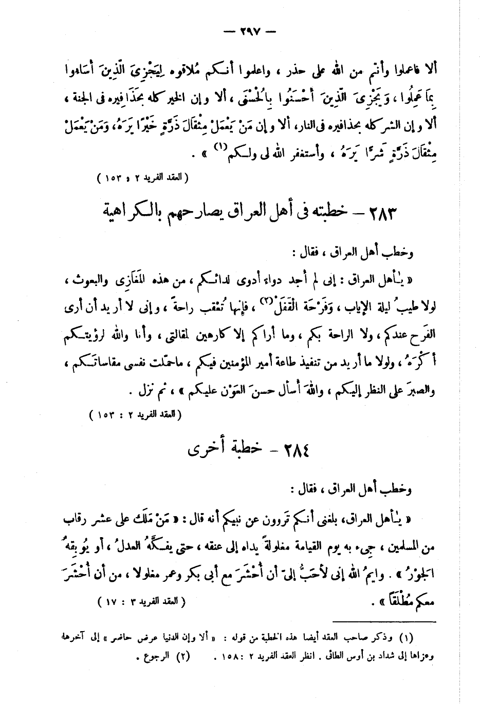 1 وذكر صاحب العقد أيضًا هذه الخطبة من قوله: "ألا وإن الدنيا عرضٌ حاضرٌ" إلى آخرها وعزاها إلى شداد بن أوس الطائي. انظر العقد الفريد 2: 158.