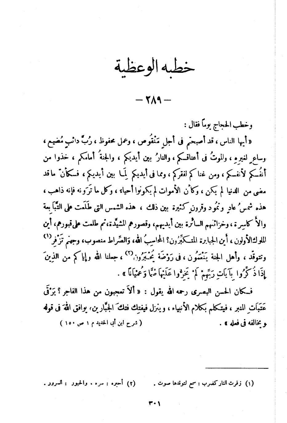 "أيها الناس، قد أصبحتم في أجل منقوص، وعمل محفوظ، رُبَّ دائبٍ مضيع، وساعٍ لغيره، والموتُ في أعناقكم، والنارُ بين أيديكم، والجنةُ أمامكم، خذوا من أنفسكم لأنفسكم، ومن غناكم لفقركم، ومما في أيديكم لما بين أيديكم؛ فكأن ما قد مضى من الدنيا لم يكن، وكأن الأموات لم يكونوا أحياء، وكل ما ترونه فإنه ذاهب، هذه شمس عاد وثمود وقرون كثيرة بين ذلك، هذه الشمس التي طلعت على التبابعة والأكاسرة، وخزائنهم السائرة بين أيديهم، وقصورهم المشيدة، ثم طلعت على قبورهم، أين الملوك الأولون، أين الجبابرة المتكبرون؟ المحاسب الله، والصراط منصوب، وجهنم تزفر1 وتتوقد، وأهل الجنة ينعمون، في روضة يحبرون2، جعلنا الله وإياكم من الذين {إِذَا ذُكِّرُوا بِآياتِ رَبِّهِمْ لَمْ يَخِرُّوا عَلَيْهَا صُمًّا وَعُمْيَانًا} .