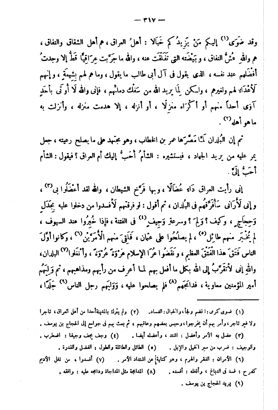 إني رأيت العراق داء عضالًا، وبها فرخ الشيطان، والله لقد أعضلوا بي3، وإني لأراني سأفرقهم في البلدان، ثم أقول: لو فرقتهم لأفسدوا من دخلوا عليه بجدل وحجاج، وكيف؟ ولم؟ وسرعة وَجِيفٍ4 في الفتنة؛ فإذا خُبِرُوا عند السيوف، لم يخبر منهم طائل5، لم يصلحوا على عثمان، فلقي منهم الأمرين6، وكانوا أول الناس فتق هذا الفتق العظيم، ونقضوا عُرا الإسلام عُروة عُروة، وأنغلوا7 البلدان، والله إني لأتقربُ إلى الله بكل ما أفعل بهم لما أعرف من رأيهم ومذاهبهم، ثم وليهم أمير المؤمنين معاوية، فدامَجَهُم8 فلم يصلحوا عليه، ووليهم رجلُ الناس9 جلدًا،