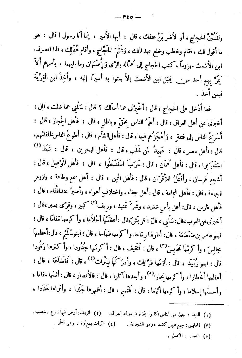 فلما أدخل على الحجاج، قال: أخبرني عما أسألك؟ قال: سلني عما شئت، قال: أخبرني عن أهل العراق، قال: أعلم الناس بحق وباطل، قال: فأهل الحجاز، قال: أسرع الناس إلى فتنة، وأعجزهم فيها، قال: فأهل الشام، قال: أطوع الناس لخلفائهم، قال: فأهل مصر، قال: عبيد لمن غلب، قال: فأهل البحرين، قال: نَبَط1 استعرَبوا، قال: فأهل عمان، قال: عَرَبٌ استنبَطُوا، قال: فأهل الموصل، قال: أشجعُ فرسان، وأقتلُ للأقران، قال: فأهل اليمن، قال: أهل سمعٍ وطاعة، ولزومٍ للجماعة، قال: فأهل اليمامة، قال: أهل جفاء، واختلاف أهواء، وأصبر عند اللقاء، قال: فأهل فارس، قال: أهل بأسٍ شديد، وشرٍّ عتيد، وريف2 كبير، وقرى يسير، قال: أخبرني عن العرب، قال: سلني، قال: قريش قال: أعظمها أحلامًا، وأكرمها مقامًا، قال: فبنو عامر بن صعصعة، قال: أطولها رماحًا وأكرمها صباحًا، قال: فبنو سليم، قال: أعظمها مجالس، وأكرمها محابس3، قال: فثقيف، قال: أكرمها جدودًا، وأكثرها وفودًا قال: فبنو زبيد، قال: أزلمها للرايات، وأدركها للترات4، قال: فقضاعة، قال: أعظمها أخطارًا، وأكرمها نجارًا5، وأبعدها آثارًا قال: فالأنصار، قال: أثبتها مقامًا، وأحسنها إسلامًا، وأكرمها أيامًا، قال: فتميم، قال: أظهرها جلدًا، وأثراها عددًا،