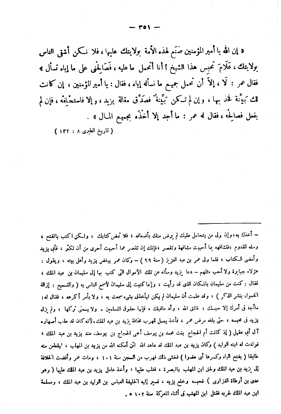 = أخذك به، وإن ولي من يتحامل عليك لم يرض منك بأضعافه؛ فلا تمض كتابك، ولكن اكتب بالفتح، وسله القدوم، فتشافهه بما أحببت مشافهة وتقصر، فإنك إن تقصر عما أحببت أحرى من أن تكثر، فأبى يزيد وأمضى الكتاب؛ فلما ولي عمر بن عبد العزيز "سنة 99" -وكان عمر يبغض يزيد وأهل بيته، ويقول: هؤلاء جبابرة ولا أحب مثلهم- دعا يزيد وسأله عن تلك الأموال التي كتب بها إلى سليمان بن عبد الملك؛ فقال: كنت من سليمان بالمكان الذي قد رأيت، وإنما كتبت إلى سليمان لأسمع الناس به "والتسميع: إزالة الخمول بنشر الذكر"، وقد علمت أن سليمان لم يكن ليأخذني بشيء سمعت به، ولا بأمر أكرهه، فقال له: ما أجد في أمرك إلا حبسك، فاتق الله، وأد ما قبلك؛ فإنها حقوق المسلمين، ولا يسعني تركها، ولم يزل يزيد في محبسه، حتى بلغه مرضُ عمر، فأخذ يعمل للهرب مخافة يزيد بن عبد الملك؛ لأنه كان قد عذب أصهاره آل أبي عقيل "إذ كانت أم الحجاج بنت محمد بن يوسف أخي الحجاج بن يوسف عند يزيد بن عبد الملك، فولدت له ابنه الوليد" وكان يزيد بن عبد الملك قد عاهد الله لئن أمكنه الله من يزيد بن المهلب، ليقطعن منه طابقًا "بفتح الباء وكسرها أي عضوا" فخشى ذلك فهرب من السجن سنة 101، ومات عمرُ وأفضت الخلافة إلى يزيد بن عبد الملك ولحق ابن المهلب بالبصرة، فغلب عليها، وأخذ عامل يزيد بن عبد الملك عليها "وهو عدي بن أرطأة الفزاري" فحبسه وخلع يزيد، فسير إليه الخليفة العباس بن الوليد بن عبد الملك، ومسلمة بن عبد الملك لحربه فقتل ابن المهلب في أسناء المعركة سنة 102هـ.