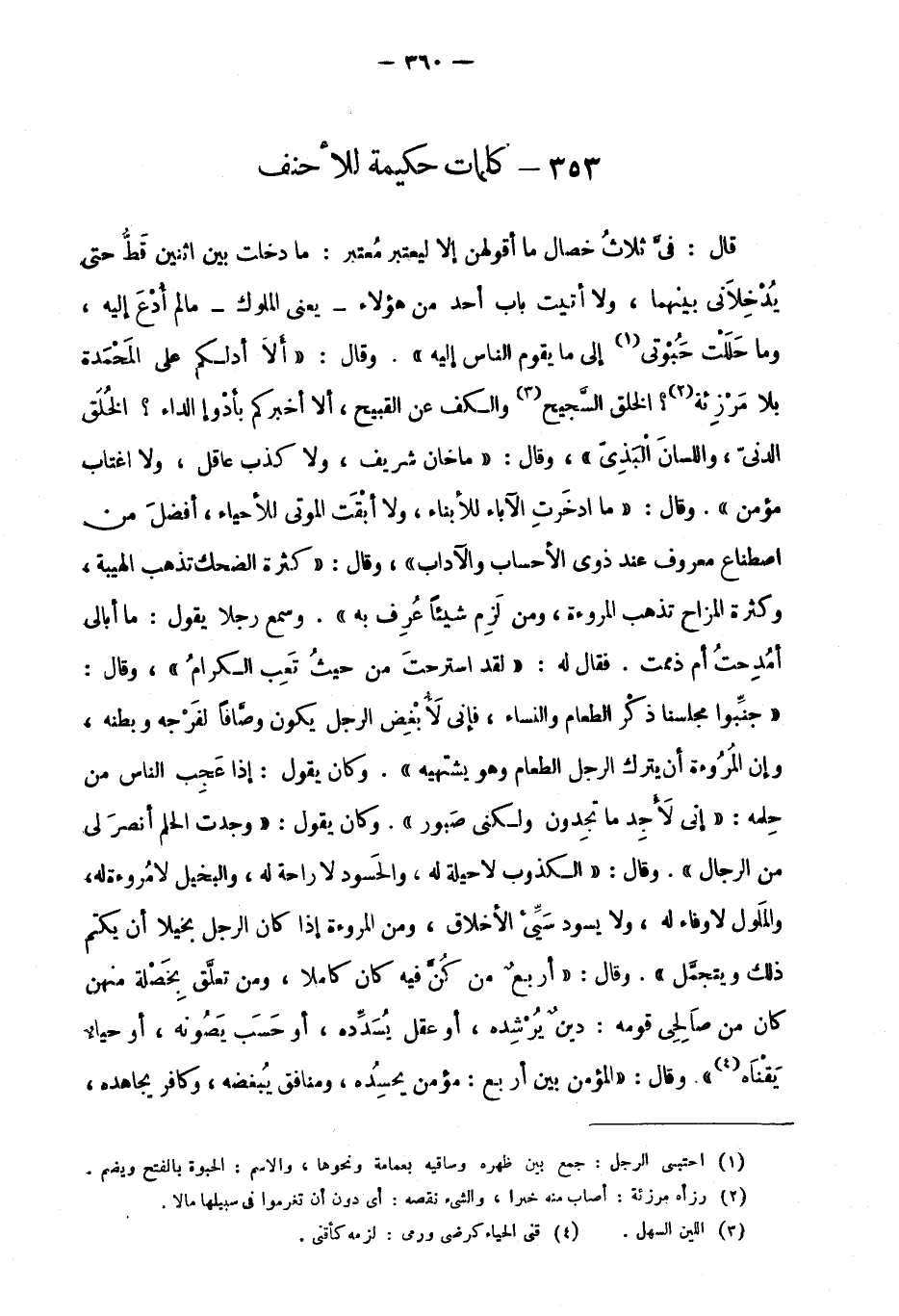 قال: فيَّ ثلاثُ خصالٍ ما أقولهن إلا ليعتبرَ معتبرٌ: ما دخلت بين اثنين قط حتى يدخلاني بينهما، ولا أتيت باب أحد من هؤلاء -يعني الملوك- ما لم أدعَ إليه، وما حللت حبوتي1 إلى ما يقوم الناس إليه". وقال: "ألا أدلكم على المحمدة بلا مرزئة2؟ الخُلُق السجيحُ3 والكفُّ عن القبيح، ألا أخبركم بأدوء الداء؟ الخلق الدنيّ، واللسان البذيّ"، وقال: "ما خان شريف، ولا كذب عاقل، ولا اغتاب مؤمن". وقال: "ما ادخرتِ الآباءُ للأبناء، ولا أبقتِ الموتى للأحياء، أفضل من اصطناع معروف عند ذوي الأحساب والآداب"، وقال: "كثرة الضحك تذهب الهيبة، وكثرة المزاح تذهب المروءة، ومن لزم شيئًا عُرِف به". وسمع رجلًا يقول: ما أبالي أمدحت أم ذممت. فقال له: "لقد استرحت من حيث تعب الكرام"، وقال: "جنبوا مجلسنا ذكر الطعام والنساء، فإني لأبغض الرجلَ يكون وصافًا فرجه وبطنه، وإن المروءة أن يترك الرجل الطعامَ وهو يشتهيه". وكان يقول: إذا عجب الناس من حلمه: إني لأجد ما تجدون ولكني صبور". وكان يقول: "وجدت الحلم أنصر لي من الرجال". وقال: "الكذوب لا حيلة له، والحسود لا راحة له، والبخيل لا مروءة له، والملول لا وفاء له، ولا يسود سيء الأخلاق، ومن المروءة إذا كان الرجل بخيلا أن يكتم ذلك ويتجمل". وقال: "أربع من كن فيه كان كاملًا، ومن تعلق بخصلة منهن كان من صالحي قومه: دين يرشده، أو عقل يسدده، أو حسب يصونه، أو حياء يقناه4". وقال: "المؤمن بين أربع: مؤمن يحسده، ومنافق يبغضه، وكافر يجاهده،