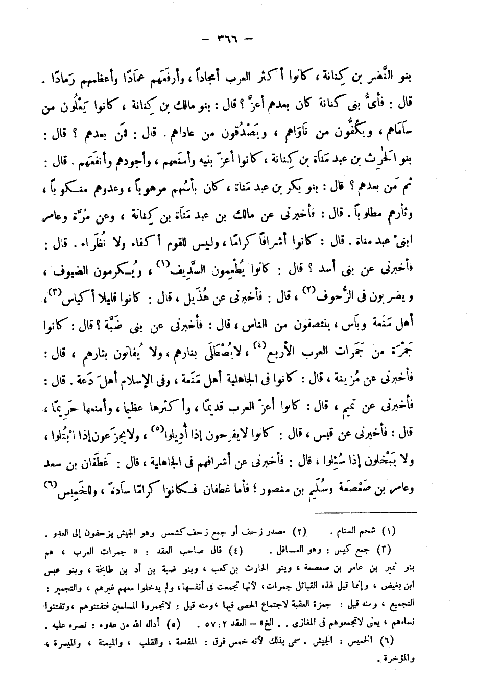 بنو النضر بن كنانة، كانوا أكثر العرب أمجادًا، وأرفعهم عمادًا وأعظمهم رمادًا. قال: فأي بني كنانة كان بعدهم أعزّ؟ قال: بنو مالك بن كنانة، كانوا يعلون من ساماهم، ويكفون من ناوأهم، ويصدقون من عاداهم. قال: فمن بعدهم؟ قال: بنو الحرب بن عبد مناة بن كنانة، كانوا أعزّ بنيه وأمنعهم، وأجودهم وأنفعهم. قال: ثم من بعدهم؟ قال: بنو بكر بن عبد مناة، كان بأسهم مرهوبًا، وعدوهم منكوبًا، وثأرهم مطلوبًا. قال: فأخبرني عن مالك بن عبد مناة بن كنانة، وعن مرة وعامر ابني عبد مناة. قال: كانا أشرافًا كرامًا، وليس للقوم أكفاء ولا نظراء. قال: فأخبرني عن بني أسد؟ قال: كانوا يطعمون السديف1، ويكرمون الضيوف، ويضربون في الزحوف2، قال: فأخبرني عن هذيل، قال: كانوا قليلًا أكياس3، أهل منعة وباس، ينتصفون من الناس، قال: فأخبرني عن بني ضبة؟ قال: كانوا جمرة من جمرات العرب الأربع4، لا يُصطَلَى بنارهم، ولا يفاتون بثارهم، قال: فأخبرني عن مزينة، قال: كانوا في الجاهلية أهل منعة، وفي الإسلام أهل دِعَة. قال: فأخبرني عن تميم، قال: كانوا أعزّ العرب قديمًا، وأكثرها عظيمًا، وأمنعها حريمًا، قال: فأخبرني عن قيس، قال: كانوا لا يفرحون إذا أُدِيلوا5، ولا يجزعون إذا ابتلوا، ولا يبخلون إذا سئلوا، قال: فأخبرني عن أشرافهم في الجاهلية، قال: غطفان بن سعد وعامر بن صعصعة وسليم بن منصور؛ فأما غطفان فكانوا كرامًا سادة، وللخميس6