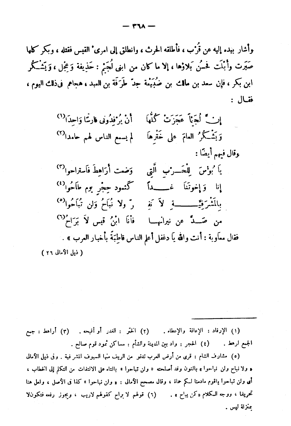 5 مشارف الشام: قرى من أرض العرب تدنوا من الريف منها السيوف المشرفية. وفي ذيل الأمالي "ولا نباح ولن نباحوا" بالنون، وقد أصلحته "ولن تباحوا" بالتاء على الالتفات من التكلم إلى الخطاب، أي ولن تباحوا يا قوم ما دمنا لكم حماة، وقال مصحح الأمالي: "ولن نباحوا" كذا في الأصل، ولعل هنا تحريفًا، ووجه الكلام "كمن يباح".