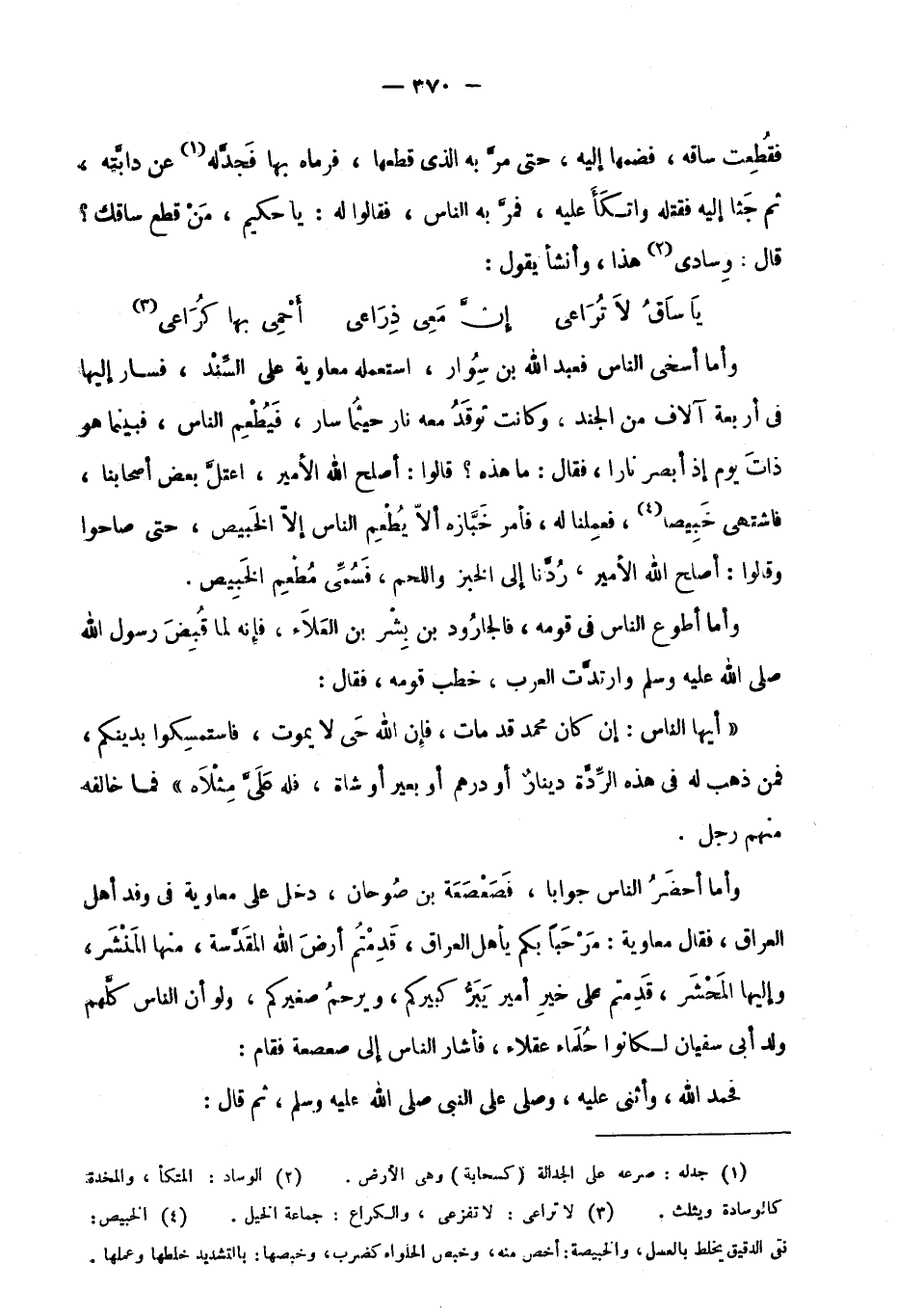 وأما أسخى الناس فعبد الله بن سوار، استعمله معاوية على السند؛ فسار إليها في أربعة آلاف من الجند، وكانت توقد معه نار حيثما سار، فيطعم الناس، فبينما هو ذات يوم إذ أبصر نارًا، فقال: ما هذه؟ قالوا: أصلح الله الأمير، اعتل بعض أصحابنا، فاشتهى خبيصًا4، فعملنا له، فأمر خبازه ألا يطعم الناس إلا الخبيص، حتى صاحوا وقالوا: أصلح الله الأمير، ردنا إلى الخبز واللحم، فسمي مطعم الخبيص.