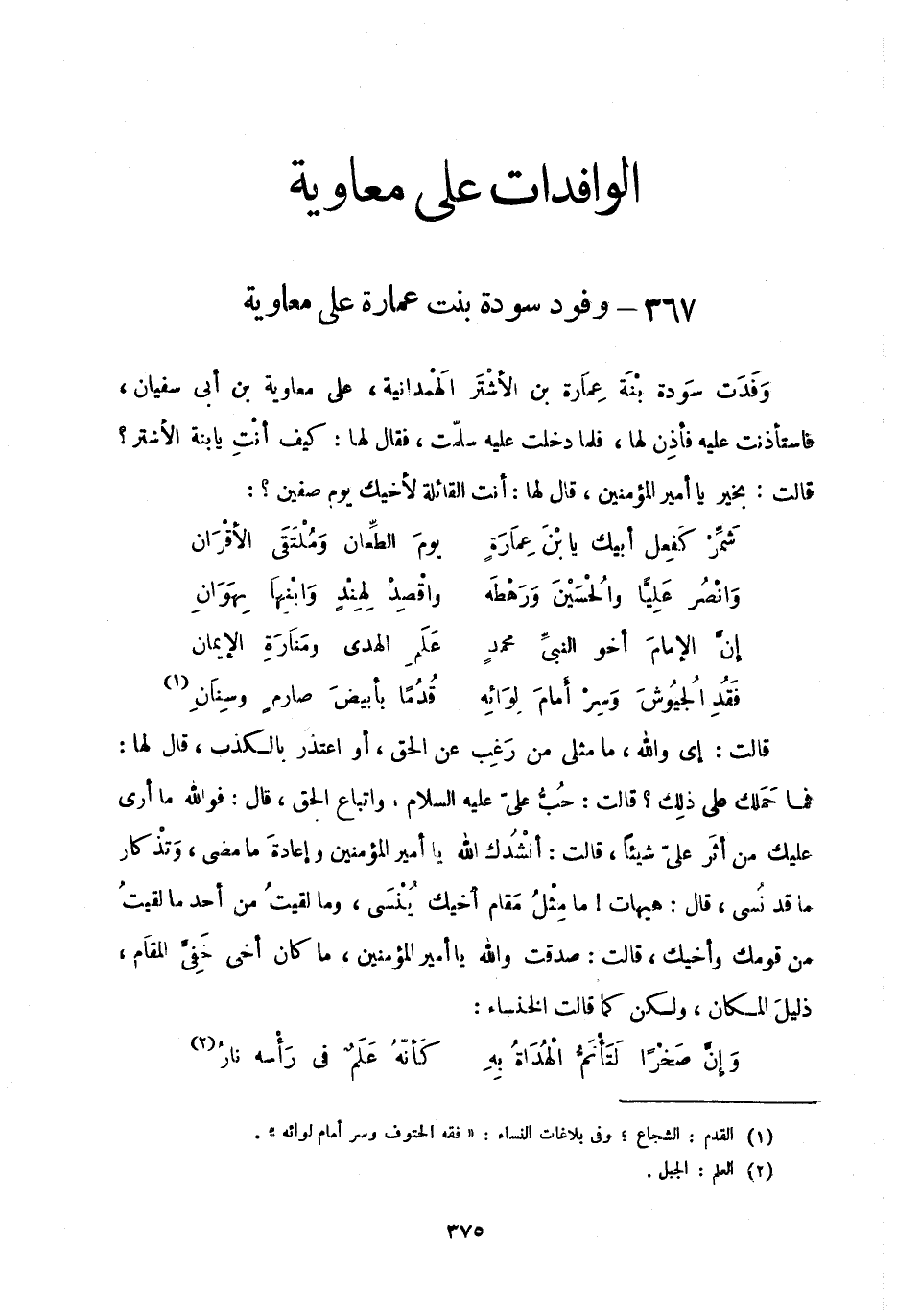 1 القدم: الشجاع؛ وفي بلاغات النساء: "فقه الحتوف وسر أمام لوائه".