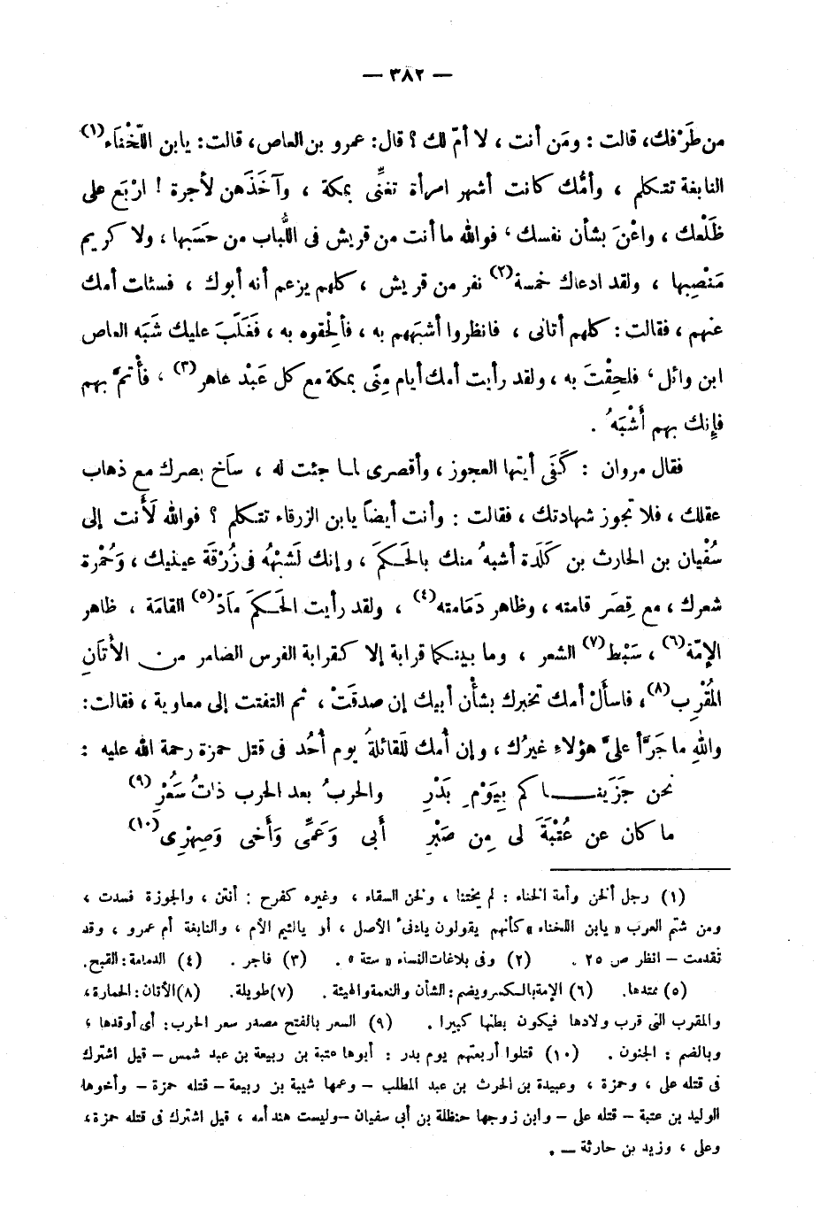 فقال مروان: كفى أيتها العجوزُ، وأقصرِي لما جئت له، ساخ بصرُك مع ذهاب عقلِك، فلا تجوز شهادتُك، فقالت: وأنت أيضًا يابن الزرقاء تتكلم؟ فوالله لأنت إلى سفيانِ بن الحارث بن كلدة أشبه منك بالحكم، وإنك لَشَبْهُه في زرقة عينيك، وحمرة شعرِك، مع قصرِ قامته، وظاهرِ دمامته4، ولقد رأيتُ الحكمَ مادّ5 القامة، ظاهر الإمّة6، سبط7 الشعر، وما بينكما قرابة إلا كقرابة الفرسِ الضامر من الأتان المُقْرِب8؛ فاسأل أمك تخبرك بشأن أبيك إن صدقتْ، ثم التفتتْ إلى معاوية، فقالت: والله ما جَرَّأَ علي هؤلاء غيرُك، وإن أمَّكَ لَلْقائلُة يومَ أحدٍ في قتل حمزةَ رحمة الله عليه: