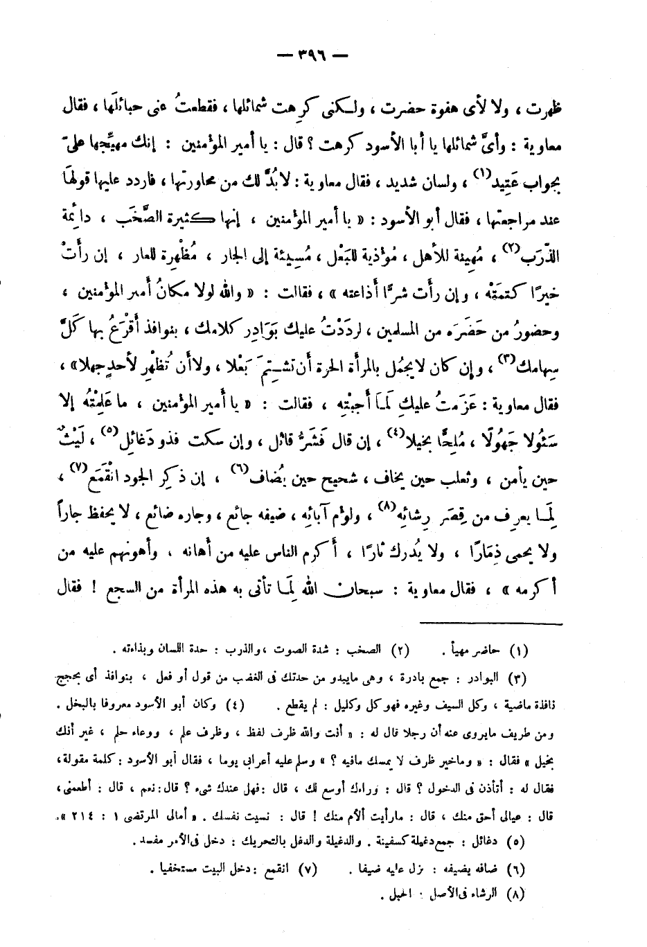ظهرت، ولا لأي هفوة حضرت؛ ولكني كرهت شمائلها، فقطعتُ عني حبائلها، فقال معاوية: وأي شمائلها يا أبا الأسود كرهتَ؟ قال: يا أمير المؤمنين: إنك مهيجها علي بجواب عتيد1، ولسان شديد، فقال معاوية: لا بد لك من محاورتها، فارددْ عليها قولها عند مراجعتها، فقال أبو الأسود: "يا أمير المؤمنين، إنها كثيرة الصخب، دائمة الذرب2، مهينة للأهل، مؤذية للبعل، مسيئة إلى الجار، مظهرة للعار، إن رأت خيرًا كتمته، وإن رأت شرًّا أذاعته"، قالت: "والله لولا مكان أمير المؤمنين، وحضور من حضره من المسلمين، لرددت عليك بوادر كلامك، بنوافذ أقرع بها كل سهامك3، وإن كان لا يجمل بالمرأة الحرة أن تشتم بعلًا، ولا أن تظهر لأحد جهلًا"، فقال معاوية: عزمت عليك لما أجبته، فقالت: "يا أمير المؤمنين، ما علمته إلا سئولًا جهولًا، ملحًا بخيلًا4، إن قال فشرُّ قائل، وإن سكتَ فذو دغائل5، ليثٌ حين يأمن، وثعلبٌ حين يخاف، شحيحٌ حين يضاف6، إن ذكر الجودُ انقمعَ7، لما يعرِف من قِصَرِ رشائه8، ولؤم آبائه، ضيفُه جائعٌ، وجارُه ضائعٌ، لا يحفظُ جارًا ولا يحمى ذمارًا، ولا يدرك نارًا، أكرم الناس عليه من أهانَه، وأهونهم عليه من أكرمَه"، فقال معاوية: سبحان الله لما تأتي به هذه المرأة من السجع! فقال