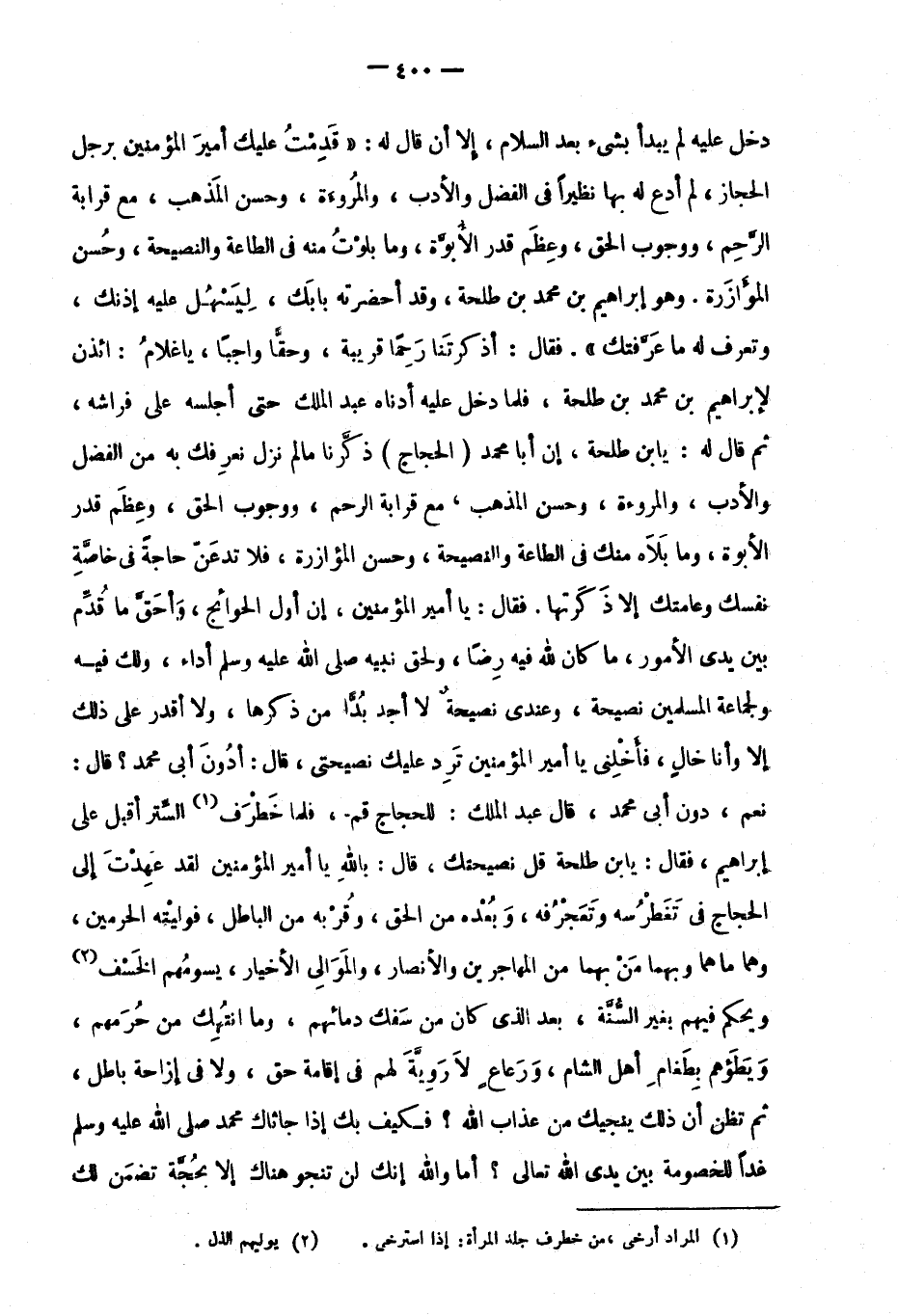 دخل عليه لم يبدأ بشيء بعد السلام، إلا أن قال له: "قدمت عليك أمير المؤمنين برجل الحجاز، لم أدع له بها نظيرًا في الفضل والأدب، والمروءة، وحسن المذهب، مع قرابة الرحم، ووجوب الحق، وعظم قدر الأبوة، وما بلوت منه في الطاعة والنصيحة، وحسن المؤازرة. وهو إبراهيم بن محمد بن طلحة، وقد أحضرته بابك، ليسهل عليه إذنك، وتعرف له ما عرَّفتك". فقال: أذكرتنا رحمًا قريبة، وحقًّا واجبًا، يا غلام: ائذن لإبراهيم بن محمد بن طلحة، فلما دخل عليه أدناه عبد الملك حتى أجلسه على فراشه، ثم قال له: يابن طلحة، إن أبا محمد "الحجاج" ذكَّرنا ما لم نعرفك به من الفضل والأدب، والمروءة، وحسن المذهب، مع قرابة الرحم، ووجوب الحق، وعظم قدر الأبوة، وما بلاه منك في الطاعة والنصيحة، وحسن المؤازرة، فلا تدعن حاجة في خاصة نفسك وعامتك إلا ذكرتها. فقال: يا أمير المؤمنين، إن أول الحوائج، وأحق ما قدم بين يدي الأمور، ما كان لله فيه رضًا، ولحق نبيه صَلَّى اللَّهُ عَلَيْهِ وَسَلَّمَ أداء، ولك فيه ولجماعة المسلمين نصيحة، وعندي نصيحة لا أجد بدًّا من ذكرها، ولا أقدر على ذلك إلا وأنا خالٍ، فأخلني يا أمير المؤمنين ترد عليك نصيحتي، قال: أدون أبي محمد؟ قال: نعم، دون أبي محمد، قال عبد الملك: للحجاج قم، فلما خطرف1 الستر أقبل على إبراهيم، فقال: يابن طلحة قل نصيحتك، قال: بالله يا أمير المؤمنين لقد عهدت إلى الحجاج في تغطرسه وتعجرفه، وبعده من الحق وقربه من الباطل، فوليته الحرمين، وهما ما هما وبهما من بهما من المهاجرين والأنصار، والموالي الأخيار، يسومهم الخسف2 ويحكم فيهم بغير السنة، بعد الذي كان من سفك دمائهم، وما انتهك من حرمهم، ويطؤهم بطغام أهل الشام، ورعاع لا روية لهم في إقامة حق، ولا في إزاحة باطل، ثم تظن أن ذلك ينجيك من عذاب الله؟ فكيف بك إذا جاثاك محمدٌ صَلَّى اللَّهُ عَلَيْهِ وَسَلَّمَ غدًا للخصومة بين يدي الله تعالى؟ أما والله إنك لن تنجو هناك إلا بحجة تضمن لك