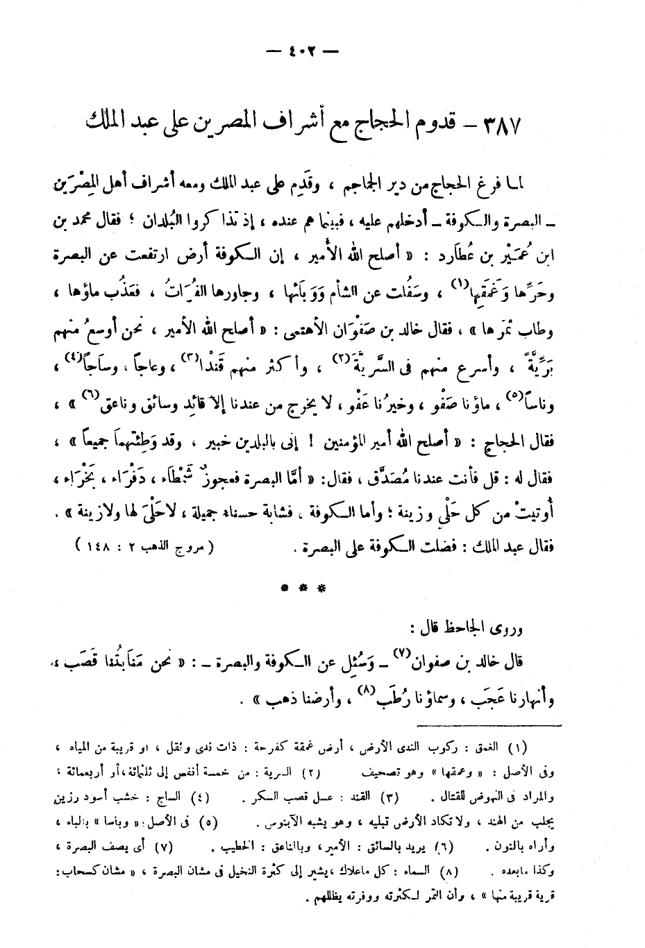 لما فرغ الحجاج من دير الجماجم، وقدم على عبد الملك ومعه أشراف أهل المصرين -البصرة والكوفة- أدخلهم عليه؛ فبينما هم عنده، إذ تذاكروا البلدان، فقال محمد بن عمير بن عطارد: "أصلح الله الأمير، إن الكوفة أرض ارتفعت عن البصرة وحرها وغمقها1، وسفلت عن الشام ووبائها، وجاورها الفرات؛ فعذب ماؤها، وطاب ثمرها"، فقال خالد بن صفوان الأهتمي: "أصلح الله الأمير، نحن أوسع منهم برية، وأسرع منهم في السرية2، وأكثر منهم قنْدًا3، وعاجًا، وساجًا4، وناسًا5، ماؤها صفو، وخيرنا عفو، لا يخرج من عندنا إلا قائدٌ وسائقٌ وناعقٌ6"؛ فقال الحجاج: "أصلح الله أمير المؤمنين! إني بالبلدين خبيرٌ، وقد وطئتهما جميعًا"، فقال له: قل فأنت عندنا مصدق، فقال: "أما البصرة فعجوز شمطاء، دفراء، بخراء، أوتيتْ من كل حلي وزينة؛ وأما الكوفة، فشابة حسناء جميلة، لا حلي لها ولا زينة".