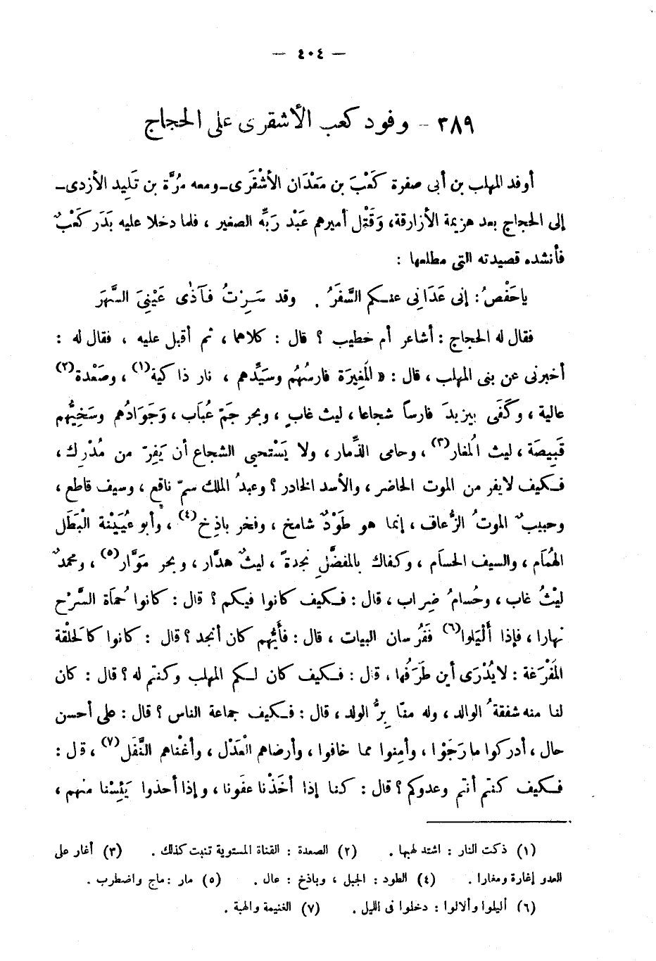 أخبرني عن بني المهلب، قال: "المغيرة فارسهم وسيدهم، نار ذاكية1، وصعدة2 عالية، وكفى بيزيد فارسًا شجاعًا، ليث غاب، وبحر جم عباب، وجوادهم وسخيهم قبيصة، ليث المغار3،وحامي الذمار، ولا يستحيي الشجاع أن يفر من مدرك؛ فكيف لا يفر من الموت الحاضر، والأسد الخادر؟ وعبد الملك سم ناقع، وسيف قاطع، وحبيب الموت الزعاف، إنما هو طود شامخ، وفخر باذخ4، وأبو عيينة البطل الهمام، والسيف الحسام، وكفاك بالمفضل نجدة، ليث هدار، وبحر موار5، ومحمد ليث غاب، وحسام ضراب، قال: فكيف كانوا فيكم؟ قال: كانوا حماة السرح نهارًا، فإذا أَلْيَلُوا6 ففرسان البيات، قال: فأيهم كان أنجد؟ قال: كانوا كالحلقة المفرغة: لا يُدرى أين طرفها، قال: فكيف كان لكم المهلب وكنتم له؟ قال: كان لنا منه شفقة الوالد، وله منا برُّ الولد، قال: فكيف جماعة الناس؟ قال: على أحسن حال، أدركوا ما رجوا، وأمنوا مما خافوا، وأرضاهم العدل، وأغناهم النفل7، قال: فكيف كنتم أنتم وعدوكم؟ قال: كنا إذا أخذنا عَفَوْنا، وإذا أخذُوا يئسنا منهم،