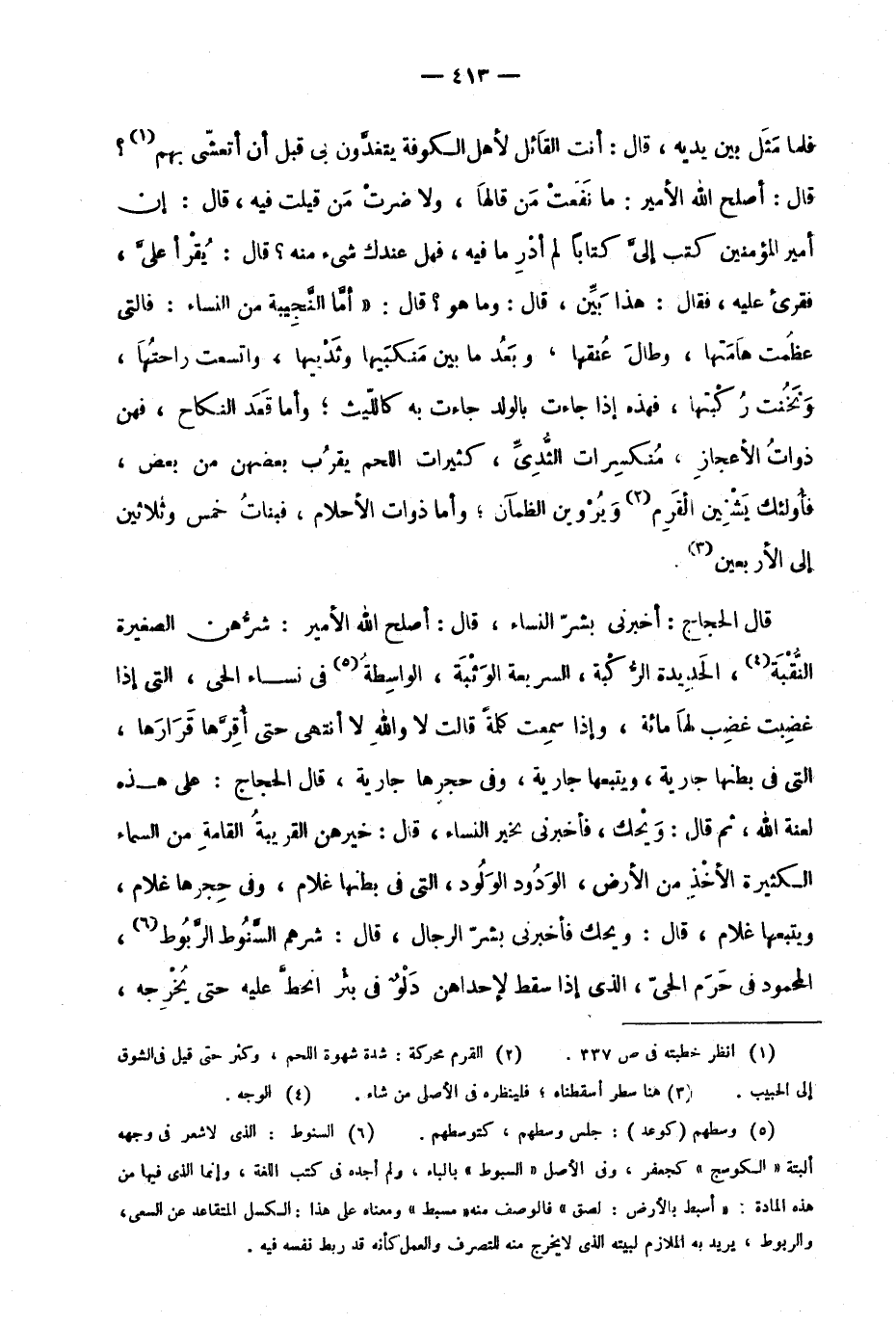 قال الحجاج: أخبرني بشرِّ النساء، قال: أصلح الله الأمير: شرهن الصغيرة النقبة4، الحديدة الركبة، السريعة الوثبة، الواسطة5 في نساء الحي، التي إذا غضبت غضب لها مائة، وإذا سمعت كلمة قالت لا والله لا أنتهي حتى أقرها قرارها، التي في بطنها جارية، ويتبعها جارية، وفي حجرها جارية، قال الحجاج: على هذه لعنة الله، ثم قال: ويحك، فأخبرني بخير النساء، قال: خيرهن القريبة القامة من السماء الكثيرة الأخذ من الأرض، الودود الولود، التي في بطنها غلام، وفي حجرها غلام، ويتبعها غلام، قال: ويحك فأخبرني بشر الرجال، قال: شرهم السنوط الربوط6، المحمود في حرم الحي، الذي إذا سقط لإحداهن دلو في بئر انحط عليه حتى يخرجه،