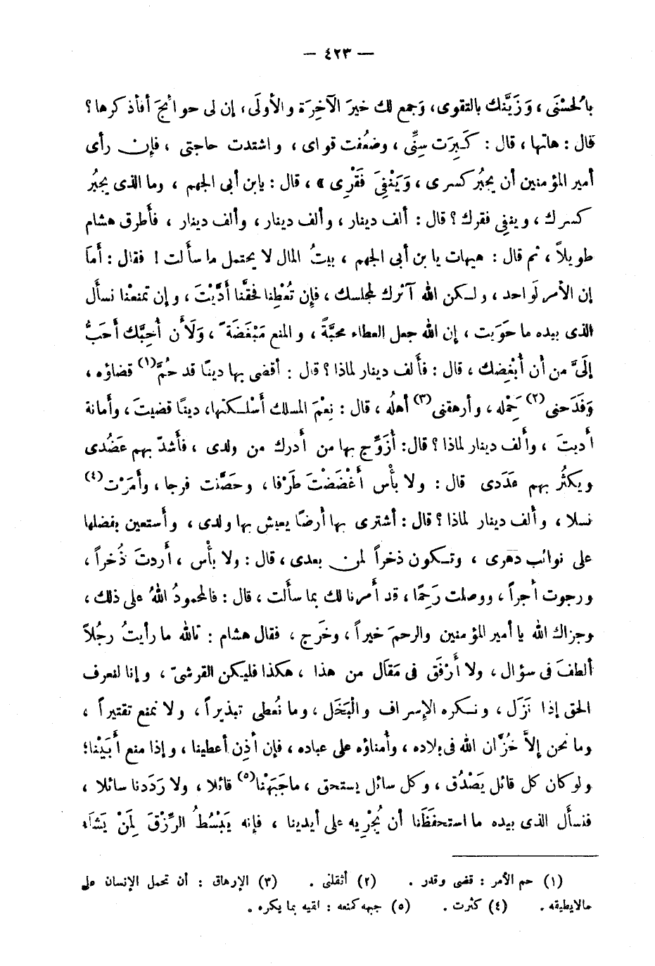 بالحسنى، وزينك بالتقوى، وجمع لك خير الآخرة والأولى، إن لي حوائج أفأذكرها؟ قال: هاتها، قال: كبرت سني، وضعفت قواي، واشتدت حاجتي، فإن رأى أمير المؤمنين أن يجبر كسري، وينفي فقري"، قال: يا ابن أبي الجهم، وما الذي يجبر كسرك، وينفي فقرك؟ قال: ألف دينار، وألف دينار، وألف دينار، فأطرق هشام طويلا، ثم قال: هيهات يا بن أبي الجهم، بيت المال لا يحتمل ما سألت! فقال: أما إن الأمر لواحد؛ ولكن الله آثرك لمجلسك، فإن تعطنا فحقنا أديت، وإن تمنعنا نسأل الذي بيده ما حويت، إن الله جعل العطاء محبة، والمنع مبغضة، ولأن أحبك أحب إلي من أن أبغضك، قال: فألف دينار لماذا؟ قال: أقضي بها دينًا قد حم1 قضاؤه، وفدحني2 حمله، وأرهقني3 أهله، قال: نعم المسلك أسلكتها، دينًا قضيت، وأمانة أديت، وألف دينار لماذا؟ قال: أزوج بها من أدرك من ولدي، فأشد بهم عضدي ويكثر بهم عددي قال: ولا بأس أغضضت طرفًا، وحصنت فرجا، وأمرت4 نسلًا، وألف دينار لماذا؟ قال: أشتري بها أرضًا يعيش بها ولدي، وأستعين بفضلها على نوائب دهري، وتكون ذخرًا لمن بعدي، قال: ولا بأس، أردت ذخرًا، ورجوت أجرًا، ووصلت رحما، قد أمرنا لك بما سألت، قال: فالمحمود الله على ذلك، وجزاك الله يا أمير المؤمنين والرحم خيرا، وخرج، فقال هشام: تالله ما رأيت رجلا ألطف في سؤال، ولا أرفق في مقال من هذا، هكذا فليكن القرشي، وإنا لنعرف الحق إذا نزل، ونكره الإسراف والبخل، وما نعطي تبذيرًا، ولا نمنع تقتيرًا، وما نحن إلا خزان الله في بلاده، وأمناؤه على عباده، فإن أذن أعطينا، وإذا منع أبينا؛ ولو كان كل قائل يصدق، وكل سائل يستحق، ما جبهنا5 قائلًا، ولا رددنا سائلًا، فنسأل الذي بيده ما استحفظنا أن يجريه على أيدينا، فإنه يبسط الرزق لمن يشاء