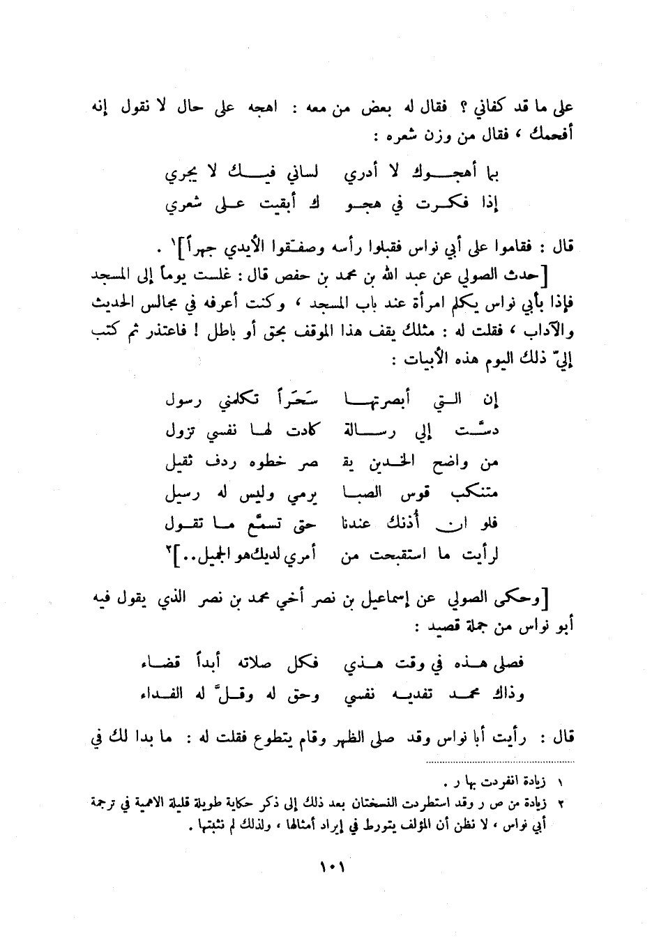 (2) زيادة من ص ر وقد استطردت النسختان بعد ذلك إلى ذكر حكاية طويلة قليلة الأهمية في ترجمة أبي نواس، لا نظن أن المؤلف يتورط في إيراد أمثالها، ولذلك لم نثبتها.