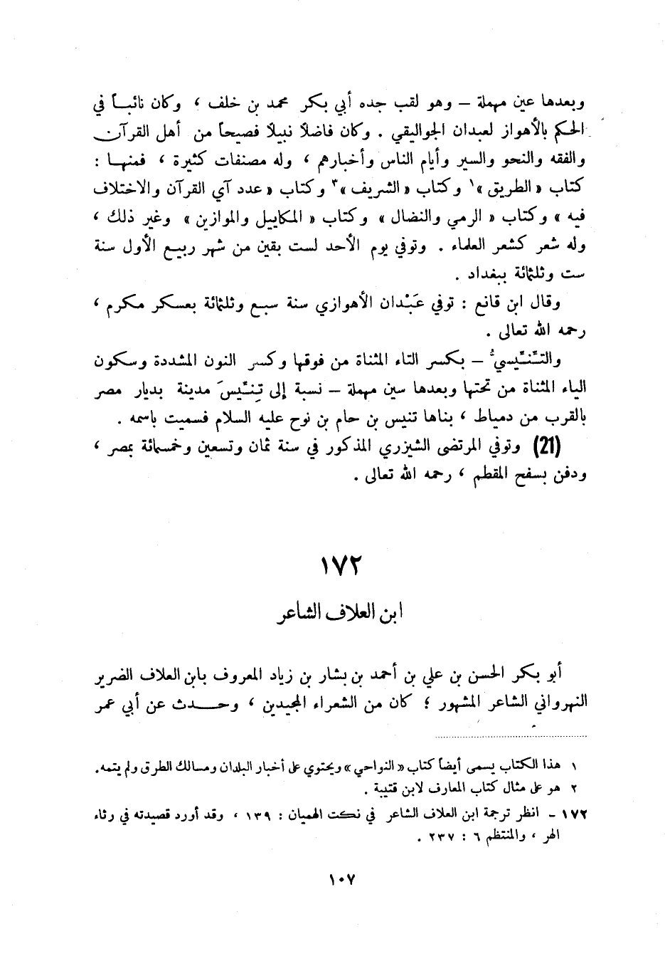 (3) انظر ترجمة ابن العلاف الشاعر في نكت الهميان: 139، وقد أورد قصيدته في رثاء الهر، والمنتظم 6: 237.