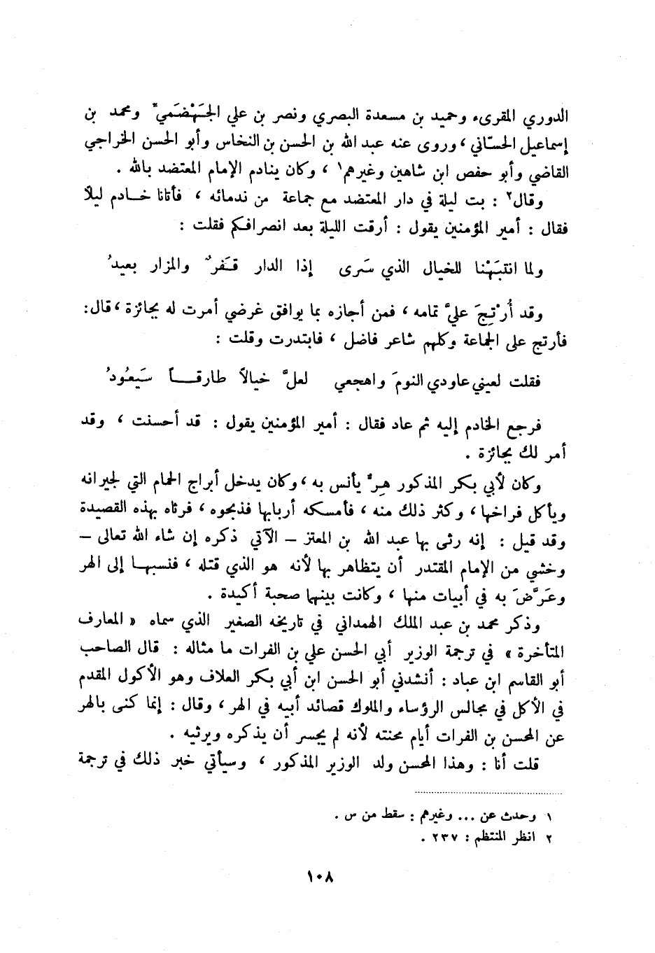وقال (2) : بت ليلة في دار المعتضد مع جماعة من ندامائه، فأتانا خادم ليلاً فقال: أمير المؤمنين يقول: أرقت الليلة بعد انصرافكم فقلت: