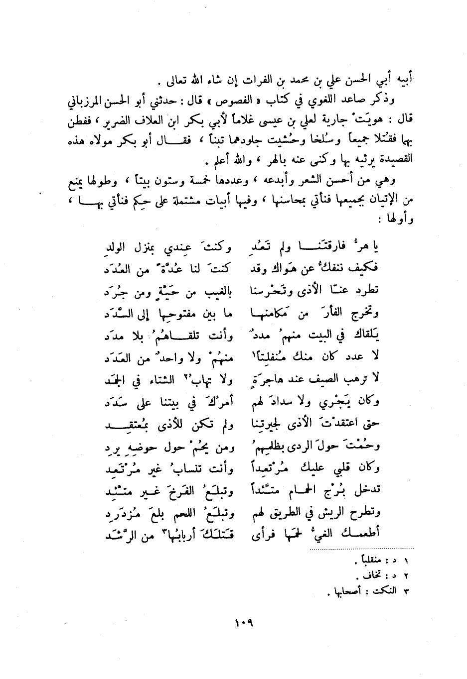 وذكر صاعد اللغوي في كتاب " الفصوص " قال: حدثني أبو الحسن المرزباني قال: هويت جارية لعلي بن عيسى غلاماً لأبي بكر ابن العلاف الضرير، ففطن بهما فقتلا جميعاً وسلخا وحشيت جلودهما تبناً، فقال أبو بكر مولاه هذه القصيدة يرثيه بها وكنى عنه بالهر، والله أعلم.
