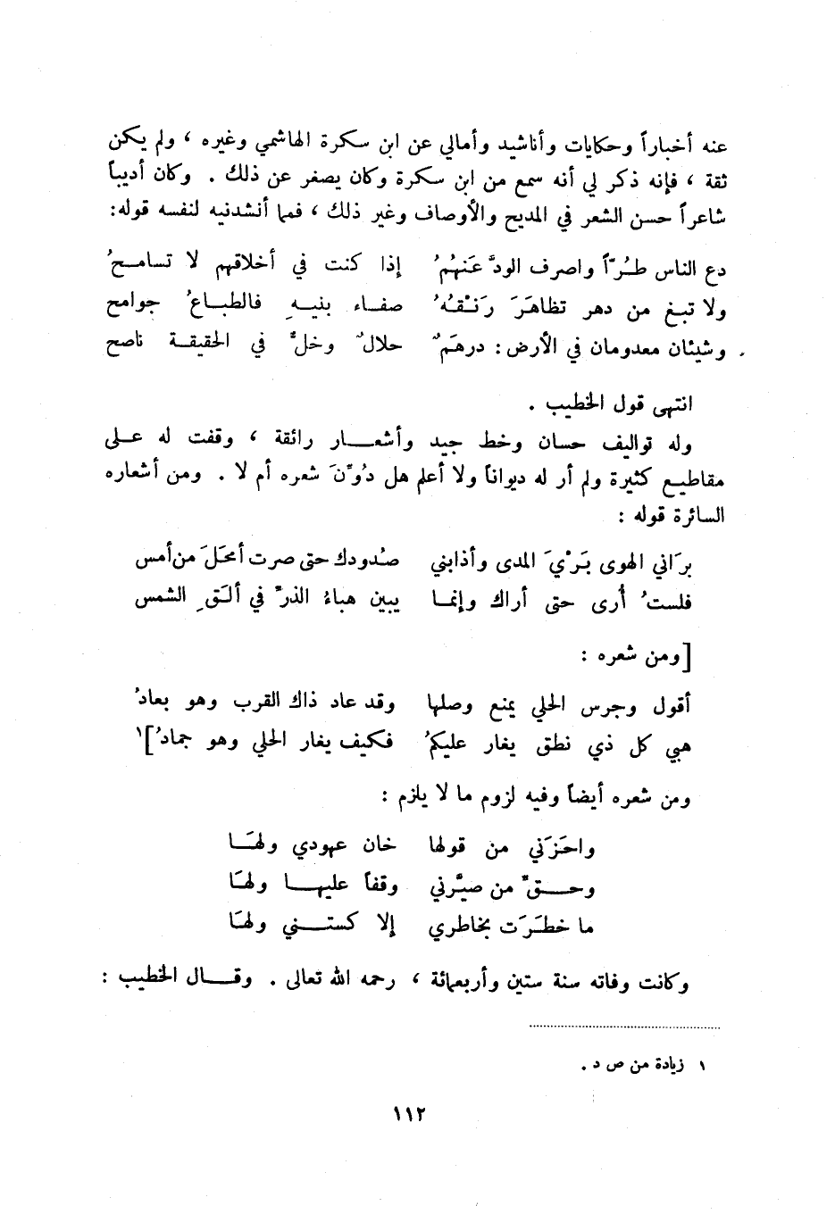 عنه أخباراً وحكايات وأناشيد وأمالي عن ابن شكرة الهاشمي وغيره، ولم يكن ثقة، فإنه ذكر لي أنه من ابن سكرة وكان يصغر عن ذلك. وكان أديباً شاعراً حسن الشعر في المديح والأوصاف وغير ذلك، فمما أنشدنيه لنفسه قوله: