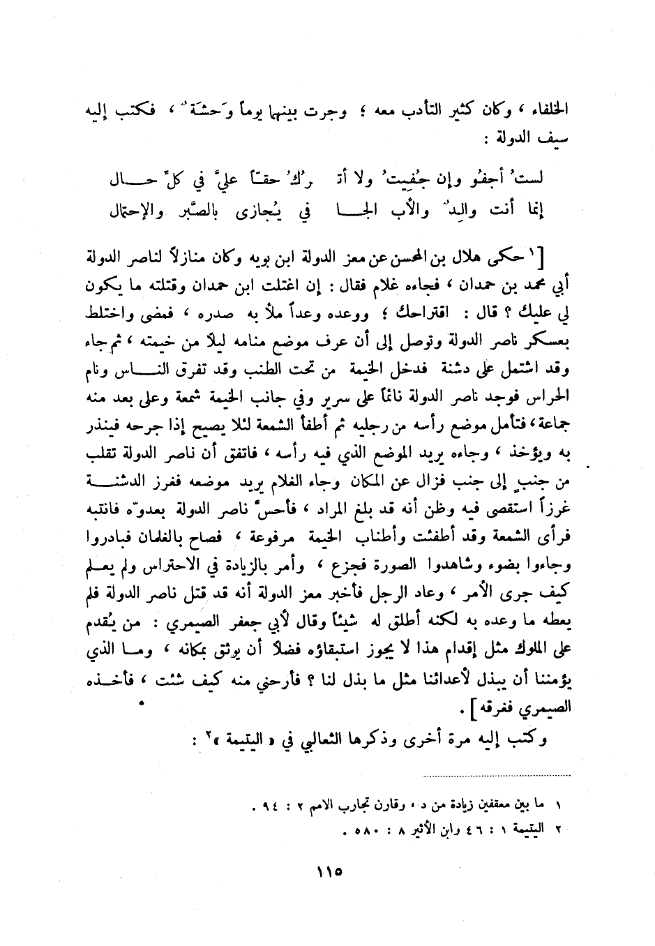 إنما أنت والد والأب الجا ... في يجازى بالصبر والإحتمال [ (1) حكى هلال بن المحسن عن معز الدولة ابن بويه وكان منازلاً لناصر الدولة أبي محمد بن حمدان، فجاءه غلام فقال: إن اغتلت ابن حمدان وقتلته ما يكون لي عليك قال: اقتراحك؛ ووعده وعداً ملأ به صدره، فمضى واختلط بعكسر ناصر الدولة وتوصل إلى أن عرف موضع منامه ليلاً من خيمته، ثم جاء وقد اشتمل على دشنة فدخل الخيمة من تحت الطنب وقد تفرق الناس ونام الحراس فوجد ناصر الدولة نائماً على سرير وفي جانب الخيمة شمعة وعلى بعد منه جماعة، فتأمل موضع رأسه من رجليه ثم أطفأ الشمعة لئلا يصيح إذا جرحه فينذر به ويؤخذ، وجاءه يريد الموضع الذي فيه رأسه، فاتفق أن ناصر الدولة تقلب من جنب إلى جنب فزال عن المكان وجاء الغلام يريد موضعه فغرز الدشنة غرزاً استقصى فيه وظن أنه قد بلغ المراد، فأحسن ناصر الدولة بعدوه فانتبه فرأى الشمعة وقد أطفئت وأطناب الخيمة مرفوعة، فصاح بالغلمان فبادروا وجاءوا بضوء وشاهدوا الصورة فجزع، وأمر بالزيادة في الاحتراس ولم يعلم كيف جرى الأمر، وعاد الرجل فأخبر معز الدولة أنه قد قتل ناصر الدولة فلم يعطه ما وعده به لكنه أطلق له شيئاً وقال لأبي جعفر الصيمري: من يقدم على الملوك مثل إقدام هذا لا يجوز استبقاؤه فضلاً أن يوثق بمكانه، وما الذي يؤمننا أن يبذل لأعدائنا مثل ما بذل لنا فأرحني منه كيف شئت، فأخذه الصيمري فغرقه] .