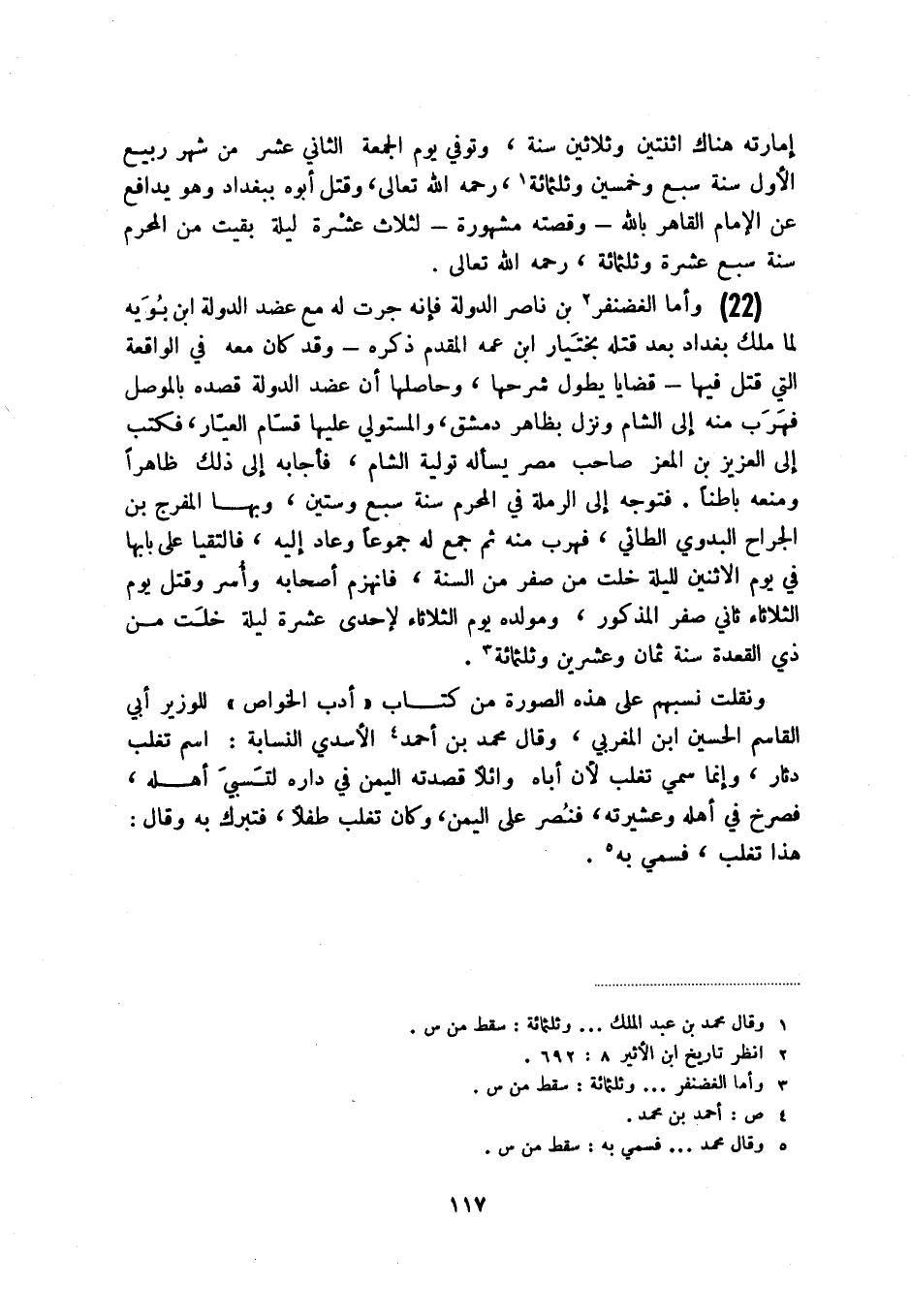 (22) وأما الغضنفر (2) بن ناصر الدولة فإنه جرت له مع عضد الدولة ابن بويه لما ملك بغداد بعد قتله بختيار ابن عمه المقدم ذكره - وقد كان معه في الواقعة التي قتل فيها - قضايا يطول شرحها، وحاصلها أن عضد الدولة قصده بالموصل فهرب منه إلى الشام ونزل بظاهر دمشق، والمستولي عليها قسام العيار، فكتب إلى العزيز بن المعز صاحب مصر يسأله تولية الشام، فأجابه إلى ذلك ظاهراً ومنعه باطناً. فتوجه إلى الرملة في المحرم سنة سبع وستين، وبها المفرج بن الجراح البدوي الطائي، فهري منه ثم جمع له جموعاً وعاد إليه، فالتقيا على بابها في يوم الاثنين لليلة خلت من صفر من السنة، فانهزم أصحابه وأسر وقتل يوم الثلاثاء ثاني صفر المذكور، ومولده يوم الثلاثاء لإحدى عشرة ليلة خلت من ذي القعدة سنة ثمان وعشرين وثلثمائة (3) .