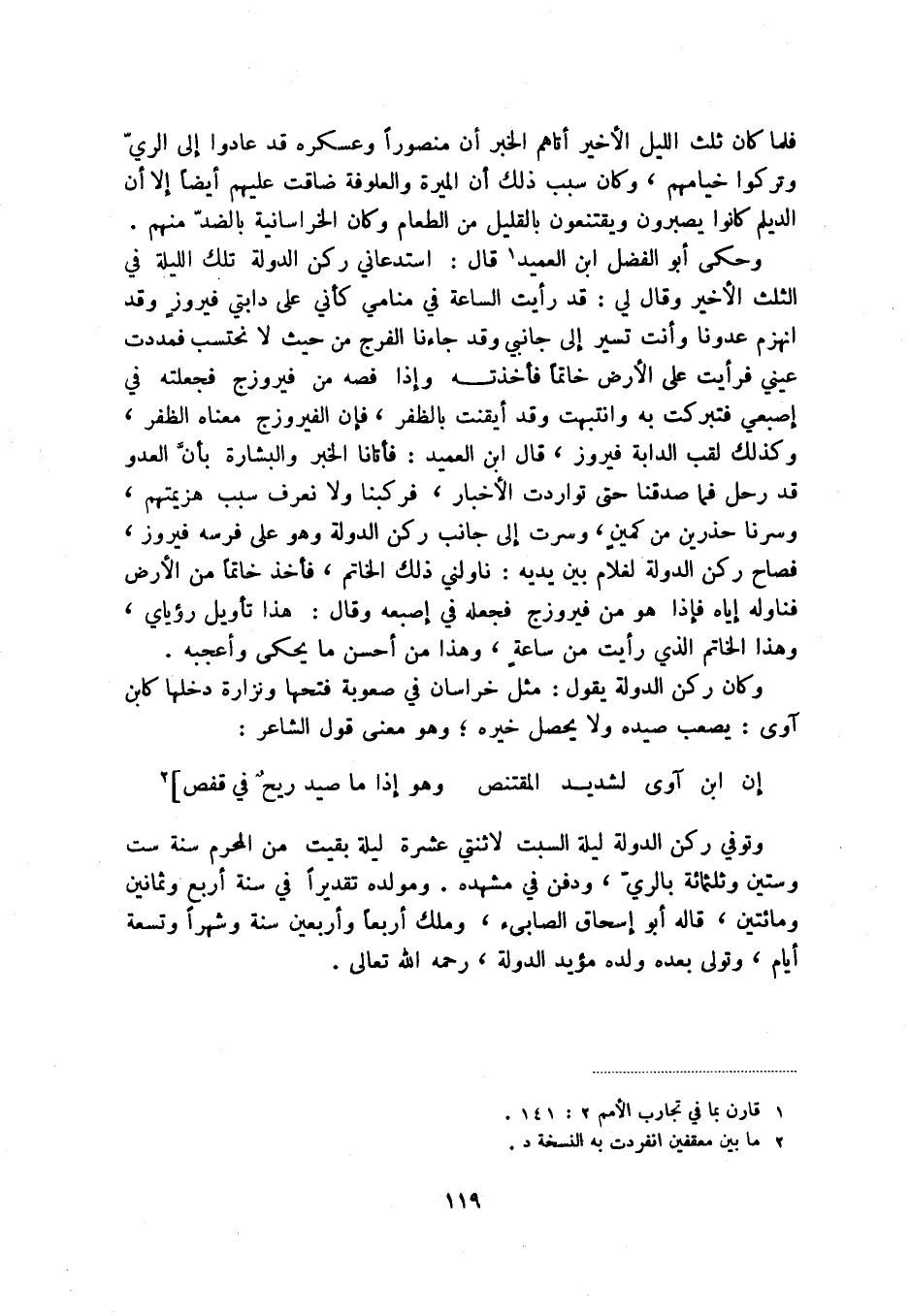 إن ابن آوى لشديد المقتنص ... هو إذا ما صيد ريح في قفص] (2) وتوفي ركن الدولة ليلة السبت لاثنتي عشرة ليلة بقيت من المحرم سنة ست وستين وثلثمائة بالري، ودفن في مشهده. ومولده تقديراً في سنة أربع وثمانين ومائتين، قاله أبو إسحاق الصابئ، وملك أربعاً وأربعين سنة وشهراً وتسعة أيام، وتوى بعده ولده مؤيد الدولة، رحمه الله تعالى.