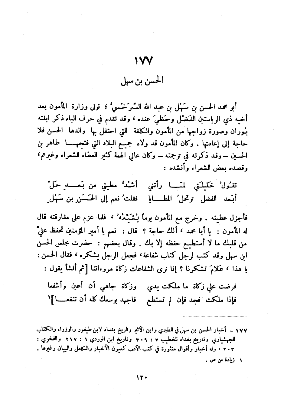 (1) أخبار الحسن بن سهل في الطبري وابن الأثير وتاريخ بغداد لابن طيفور والوزراء والكتاب للجهشياري وتاريخ بغداد للخطيب 7: 309 وتاريخ ابن الوردي 1: 217 والفخري: 203، وله أخبار وأقوال منثورة في كتب الأدب كعيون الأخبار والكامل والبيان وغيرها.
