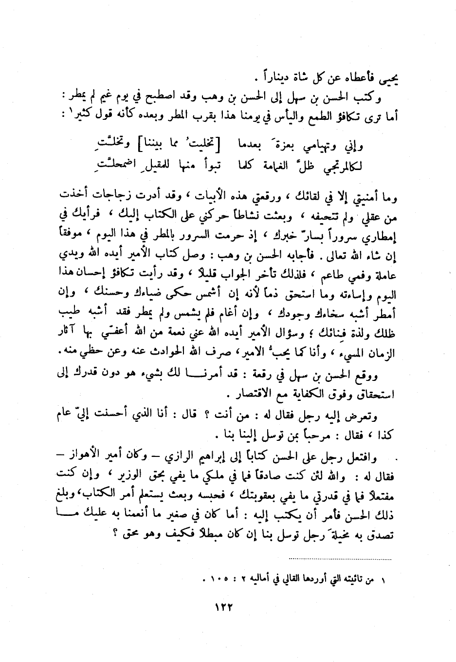 وكتب الحسن بن سهل إلى الحسن بن وهب وقد اصطبح في يوم غنيم لم يمطر: أما ترى تكافؤ الطمع واليأس في يومنا هذا بقرب المطر وبعده كأنه قول كثير (1) :