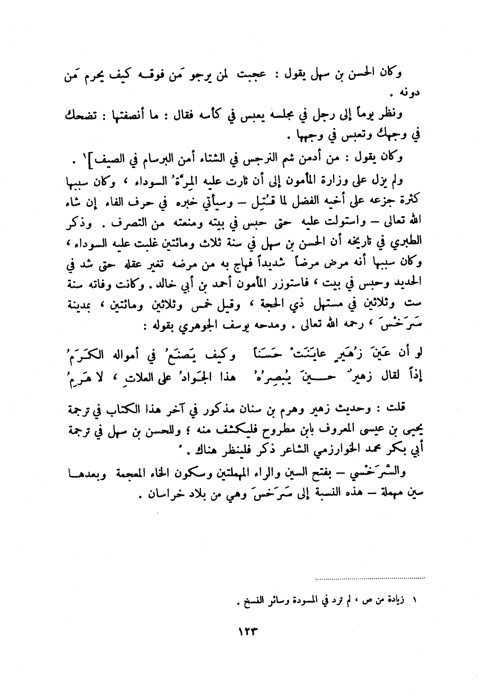 إذا لقال زهير حين يبصره ... هذا الجواد على العلات، لا هرم قلت: وحديث زهير وهرم بن سنان مذكور في آخر هذا الكتاب في ترجمة يحيى بن عيسى المعروف بابن مطروح فليكشف منه؛ وللحسن بن سهل في ترجمة أبي بكر محمد الخوارزمي الشاعر ذكر فلينظر هناك.