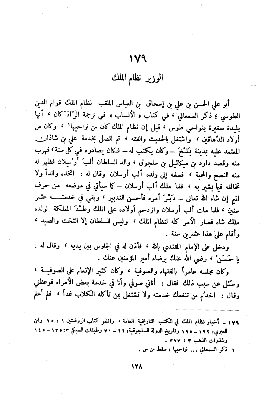 (1) أخبار نظام الملك في الكتب التاريخية العامة، وانظر كتاب الروضتين 1: 25 وابن العبري: 192 - 195 وتاريخ الدولة السلجوقية: 66 - 71 وطبقات السبكي 3: 135 - 145 وشذرات الذهب 3: 373.