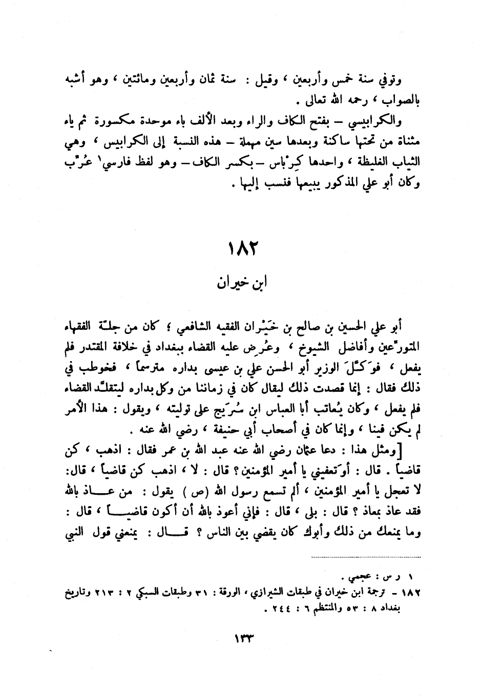 (2) ترجمة ابن خيران في طبقات الشيرازي، الورقة: 31 وطبقات السبكي 2: 213 وتاريخ بغداد 8: 53 والمنتظم 6: 244.