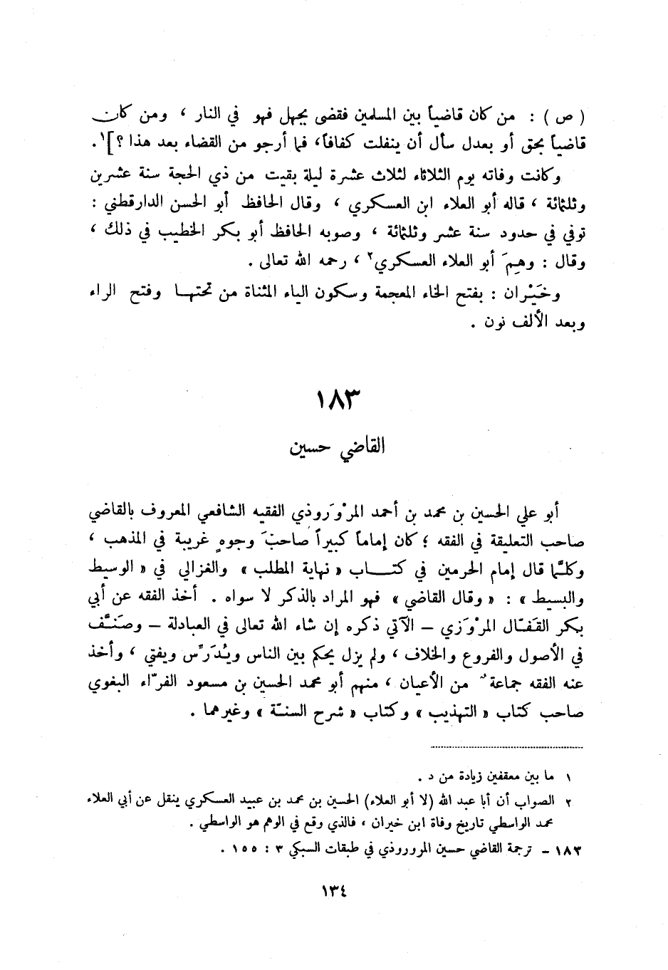 (2) الصواب أن أبا عبد الله (لا أبو العلاء) الحسين بن محمد بن عبيد العسكري ينقل عن أبي العلاء محمد الواسطي تاريخ وفاة ابن خيران، فالذي وقع في الوهم هو الواسطي.