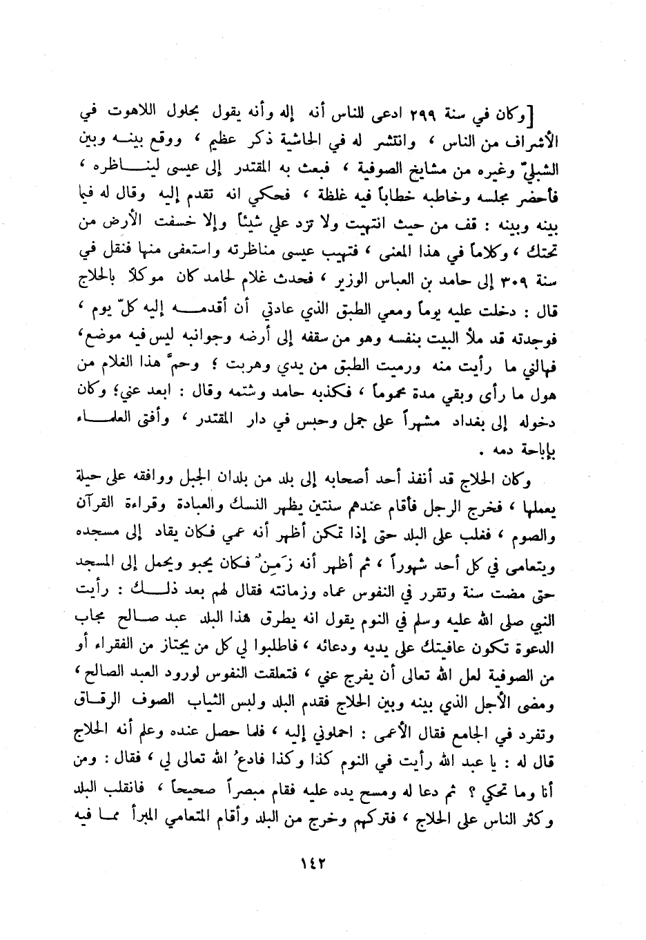 [وكان في سنة 299 ادعى للناس أنه إله وأنه يقول بحلول اللاهوت في الأشراف من الناس، وانتشر له في الحاشية ذكر عظيم، ووقع بينه وبين الشبلي وغيره من مشايخ الصوفية، فبعث به المقتدر إلى عيسى ليناظره، فأحضر مجلسه وخاطبه خطاباً فيه غلظة، فحكي انه تقدم إليه وقال له فيما بينه وبينه: قف من حيث انتهيت ولا تزد علي شيئاً وإلا خسفت الأرض من تحتك، وكلاماً في هذا المعنى، فتهيب عيسى مناظرته واستعفى منها فنقل في سنة 309 إلى حامد بن العباس الوزير، فحدث غلام لحامد كان موكلاً بالحلاج قال: دخلت عليه يوماً ومعي الطبق الذي عادتي أن أقدمه إليه كل يوم، فوجدته قد ملأ البيت بنفسه وهو من سقفه إلى أرضه وجوانبه ليس فيه موضع، فهالني ما رأيت منه ورميت الطبق من يدي وهربت؛ وحم هذا الغلام من هول ما رأى وبقي مدة محموماً، فكذبه حامد وشتمه وقال: ابعد عني؛ وكان دخوله إلى بغداد مشهراً على جمل وحبس في دار المقتدر، وأفتى العلماء بإباحة دمه.